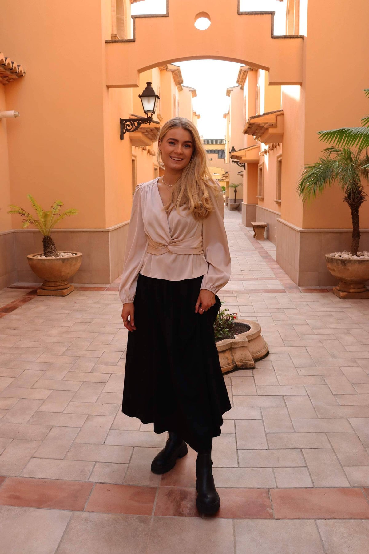 Liberte-merkin pusero vaalean beigeissä samppanjansävyissä, valmistettu 100 % polyesteristä. Puserossa on kiertoyksityiskohta edessä ja rypytetty osa takana.