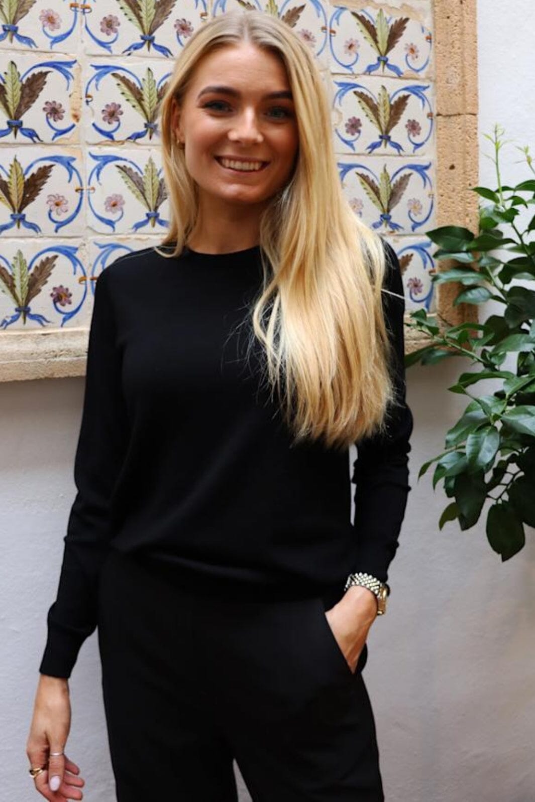 Musta neulepaita Liberte:ltä pyöreällä kaula-aukolla ja pitkillä hihoilla. Yksinkertainen tyyli tekee siitä helpon yhdistää sekä farkkujen että hameiden kanssa.