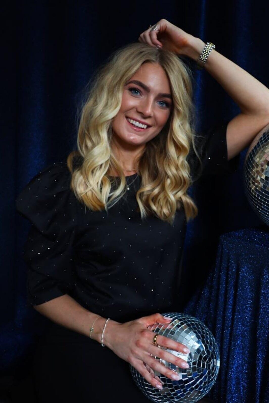 Musta Liberte-pusero, jossa on kiiltäviä paljetteja pilkkukuosissa. Puserossa on 3/4-hihat ja pyöreä pääntie.