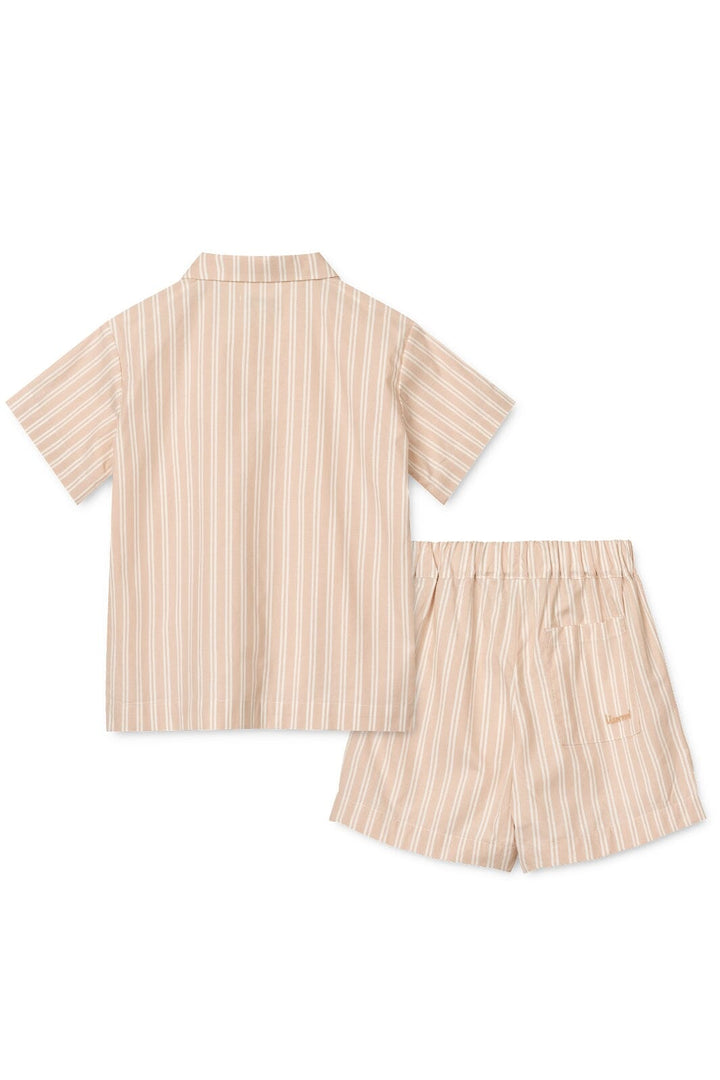 Raidallinen setti Liewoodilta vaaleanpunaisena ja kerma-valkoisena. Setti koostuu lyhythihaisesta paidasta, jossa on kaulus ja tasku, sekä yhteensopivista shortseista, jotka on valmistettu luomupuuvillasta.