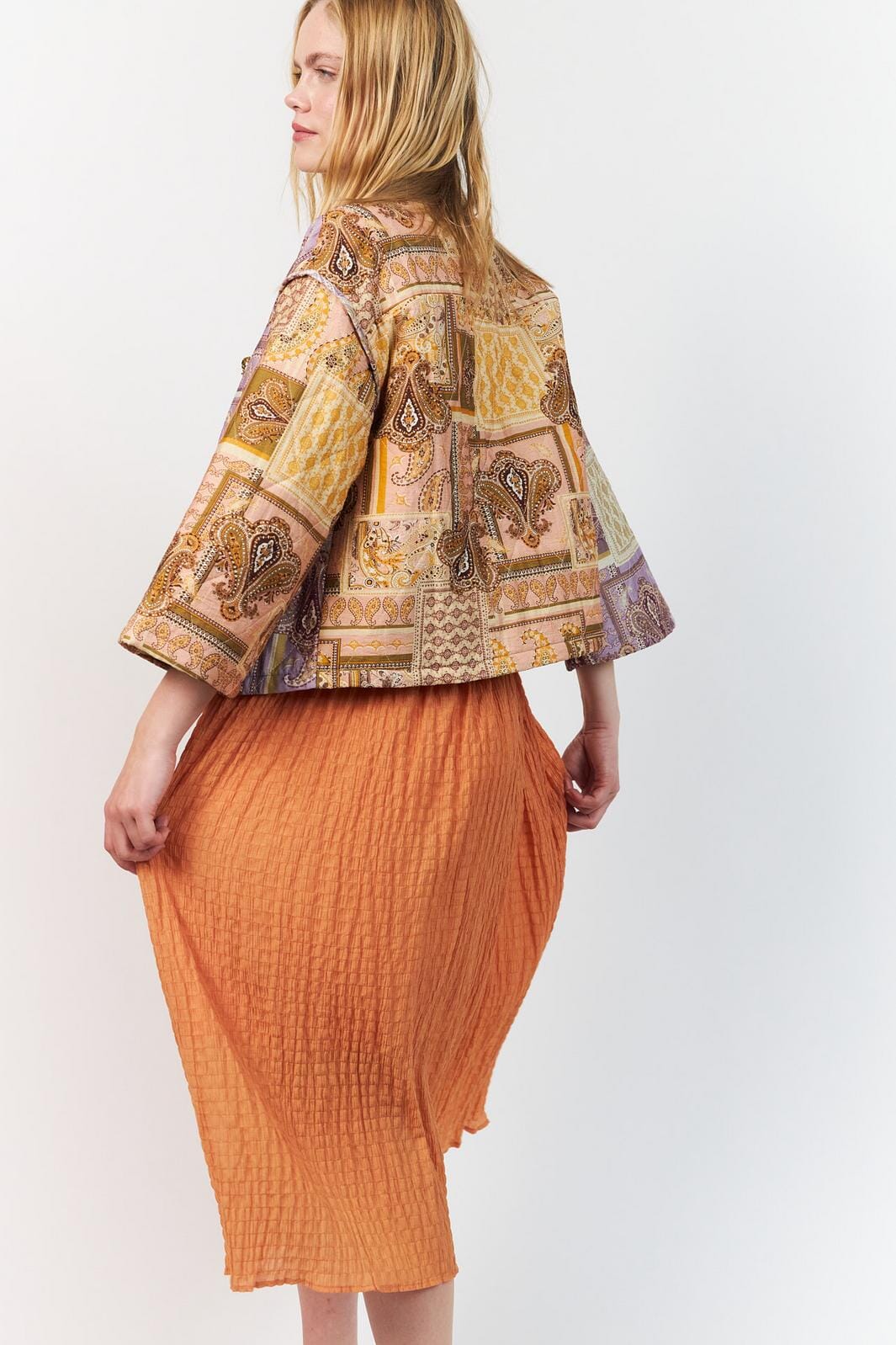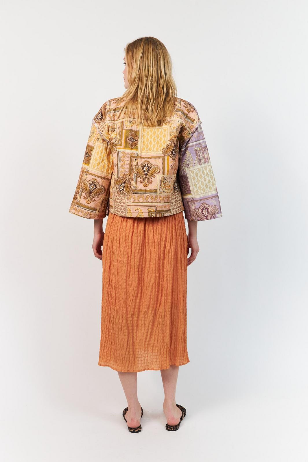 Vaatteet Lollys Laundry -merkkiltä, jossa on värikäs patchwork-muotoilu paisley- ja geometrisilla kuvioilla. Takissa on 3/4-hihat ja löysä malli.
