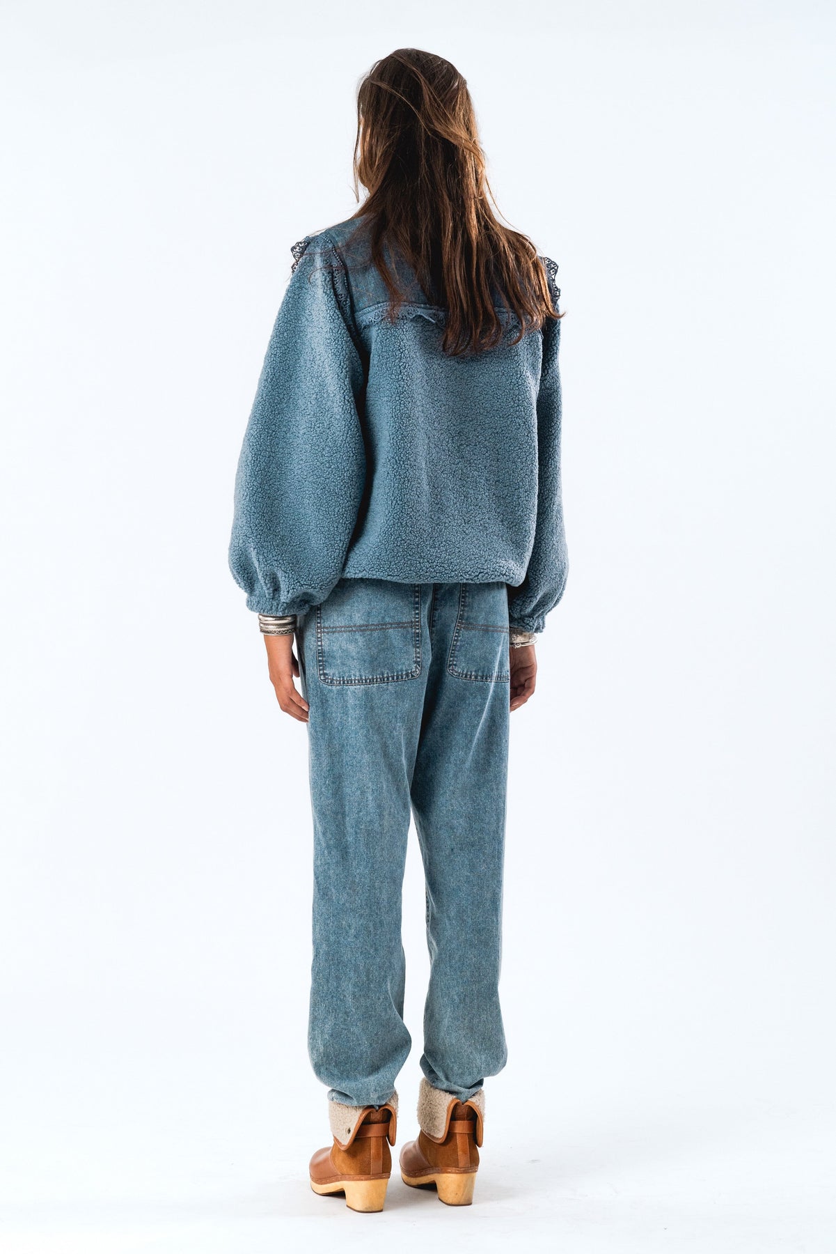 Pölyinen sininen takki Lollys Laundrylta, jossa on pörröinen tekstuuri ja tikattu yläosa. Korkea kaulus ja pitkät hihat tarjoavat hyvää suojaa kylmältä.