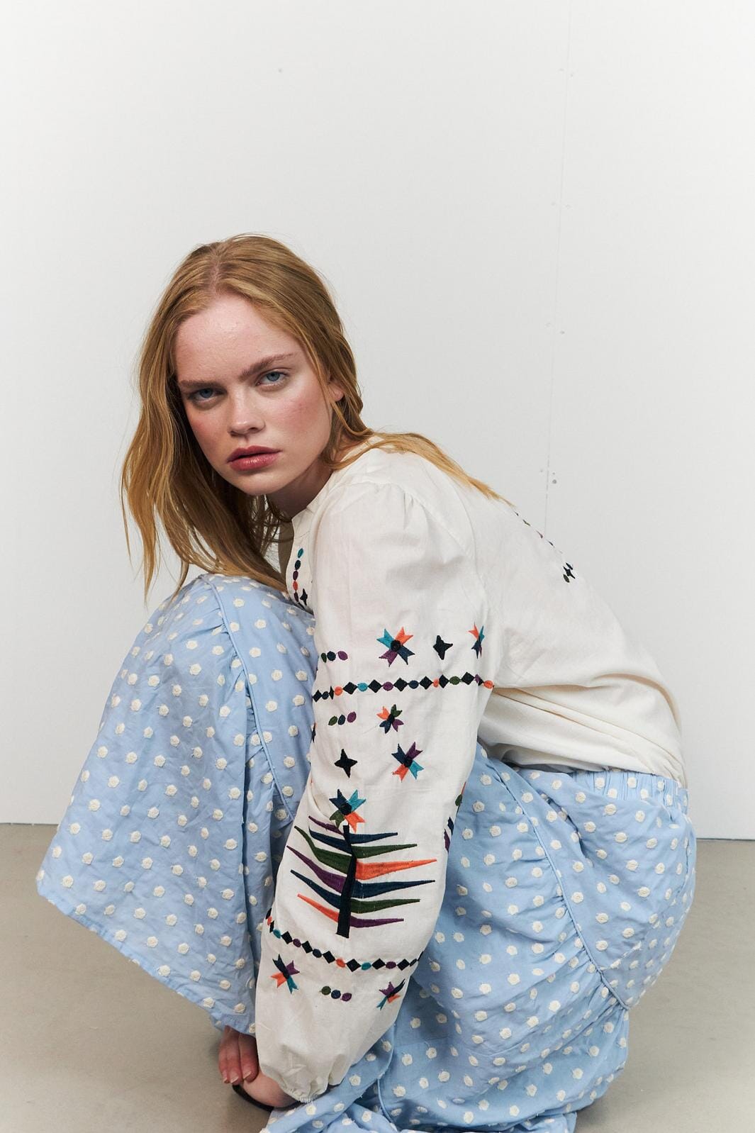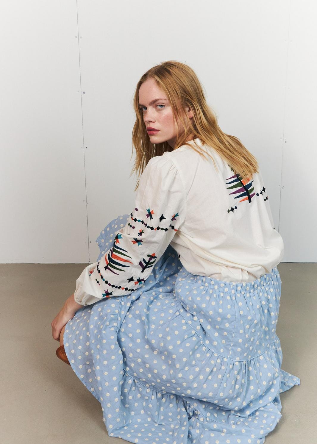 Vaaleansininen hame Lollys Laundrylta, 100 % puuvillaa. Hameessa on valkoinen pilkkukuosi ja kerroksellinen muotoilu röyhelöillä.