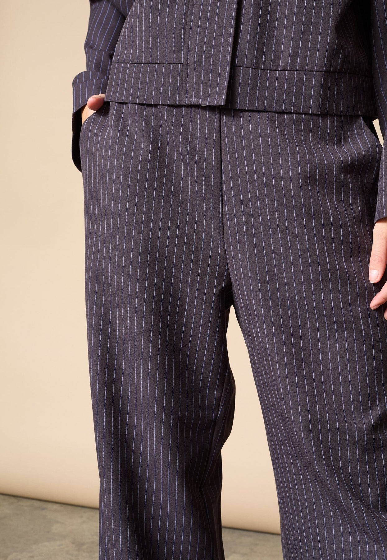 Tummansiniset raidalliset housut Love & Divinelta, joissa on väljä istuvuus ja täyspitkä lahje. Housuissa on korkea vyötärö, jossa on kuminauha takana, sekä sivutaskut.
