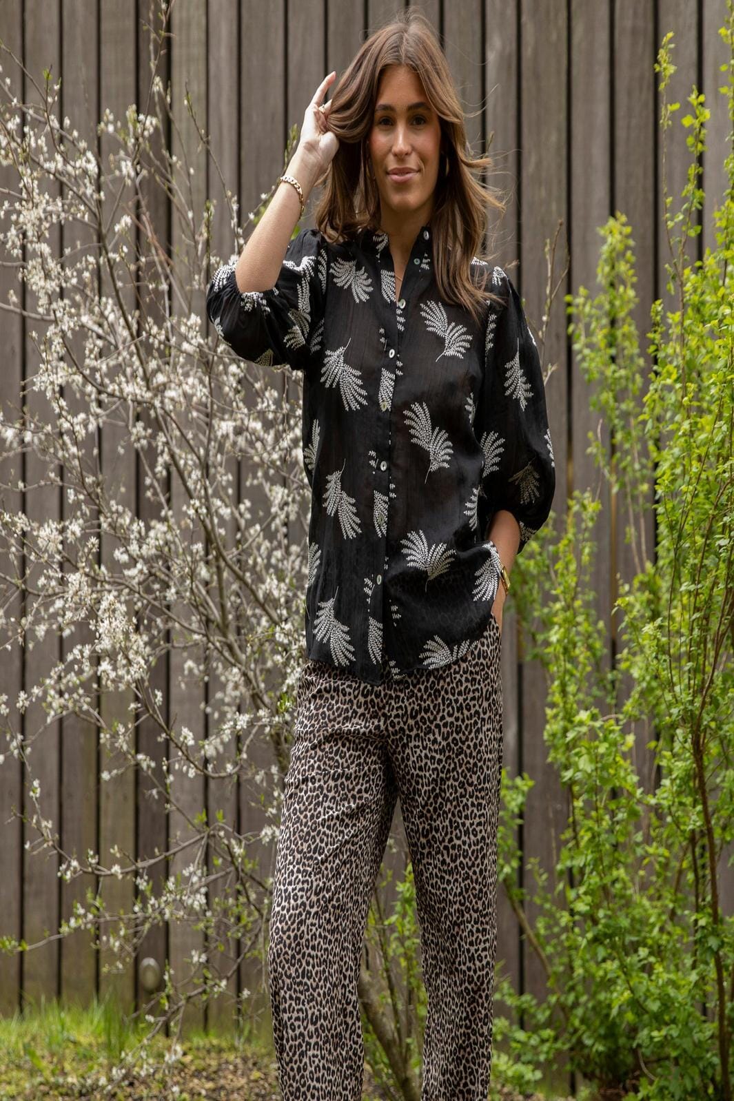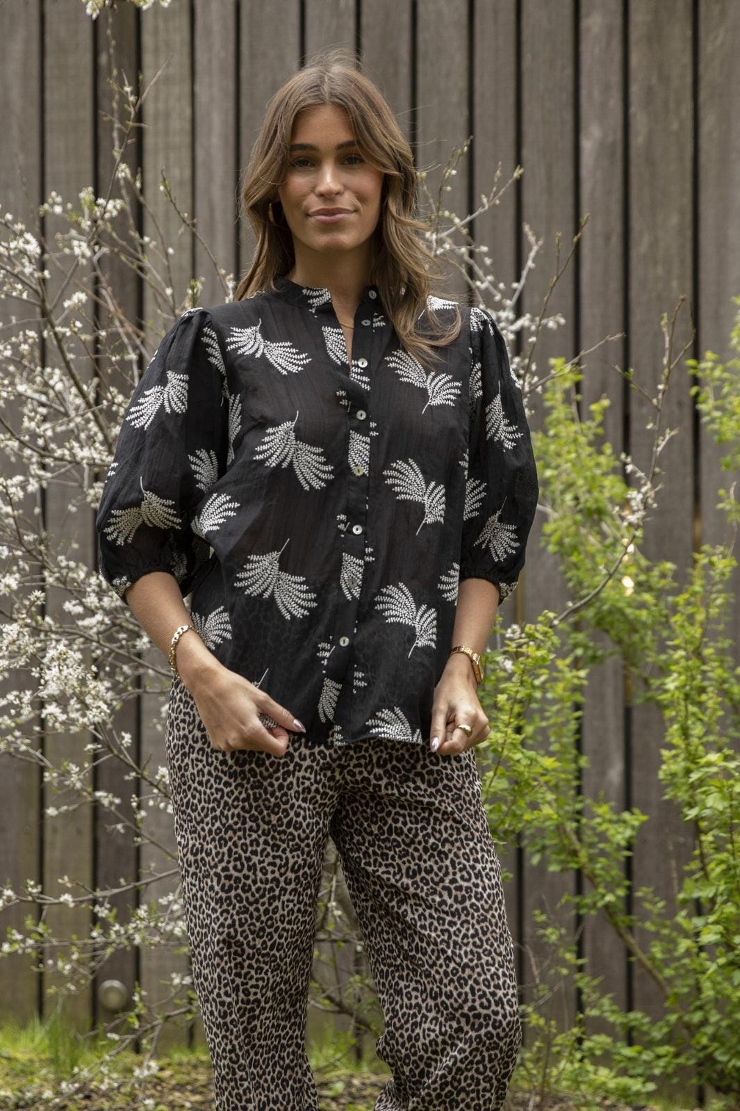 Musta paita Love & Divine -merkiltä valkoisella sananjalkakuviolla. Paidassa on kiinakaarroke, napitus edessä ja 3/4-hihat, joissa on pallovaikutus.