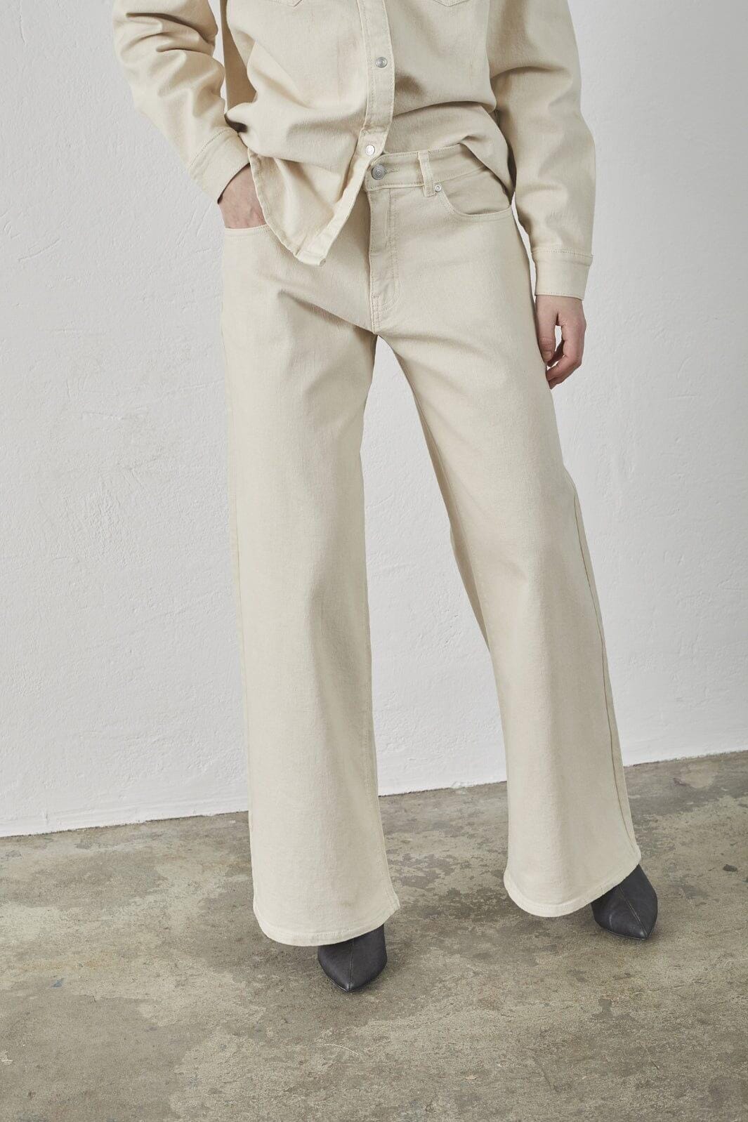 Vaaleat beiget housut Love & Divine -merkkiltä, joissa on leveä lahjesuunnittelu. Vaalea posliiniväri tekee housuista helppoja yhdistää muihin väreihin ympäri vuoden.
