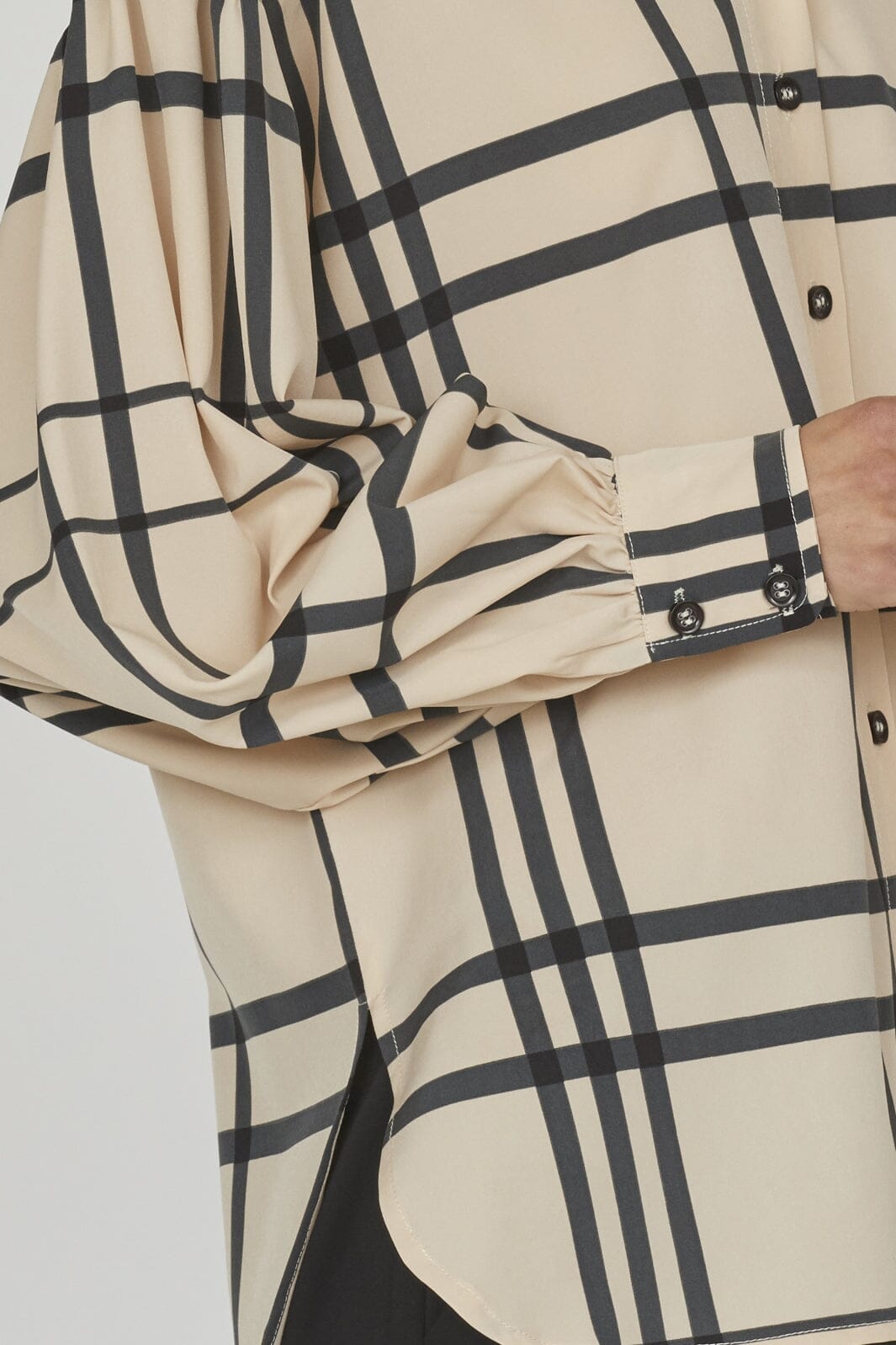 Ruudullinen paita Love & Divine -merkiltä beige ja musta. Siinä on pitkät hihat, joissa on kevyt puffivaikutus, ja klassinen kauluspaita. Edessä olevat napit tekevät siitä helpon pukea ja riisua.