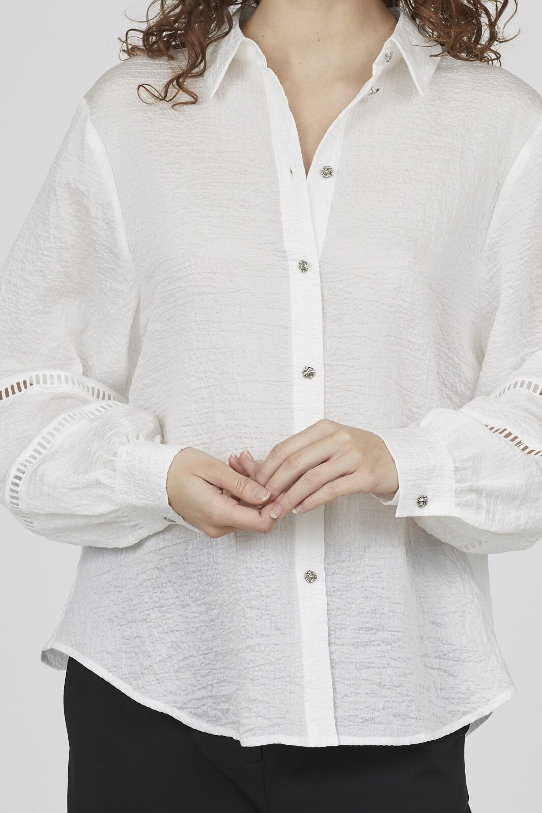 Valkoinen paita Love & Divine -merkiltä, jossa on kauluspaita ja pitkät puffihihat. Paidassa on pitsiyksityiskohtia hihoissa ja hopeanväriset napit koko matkalta alas.