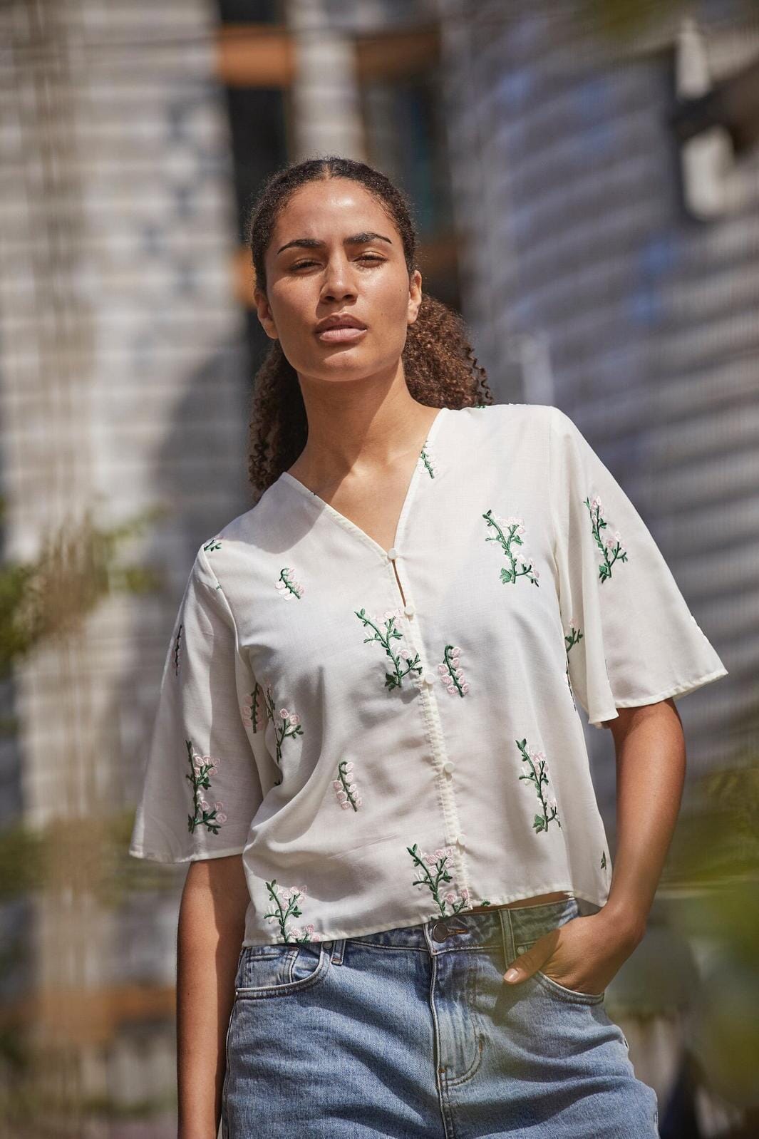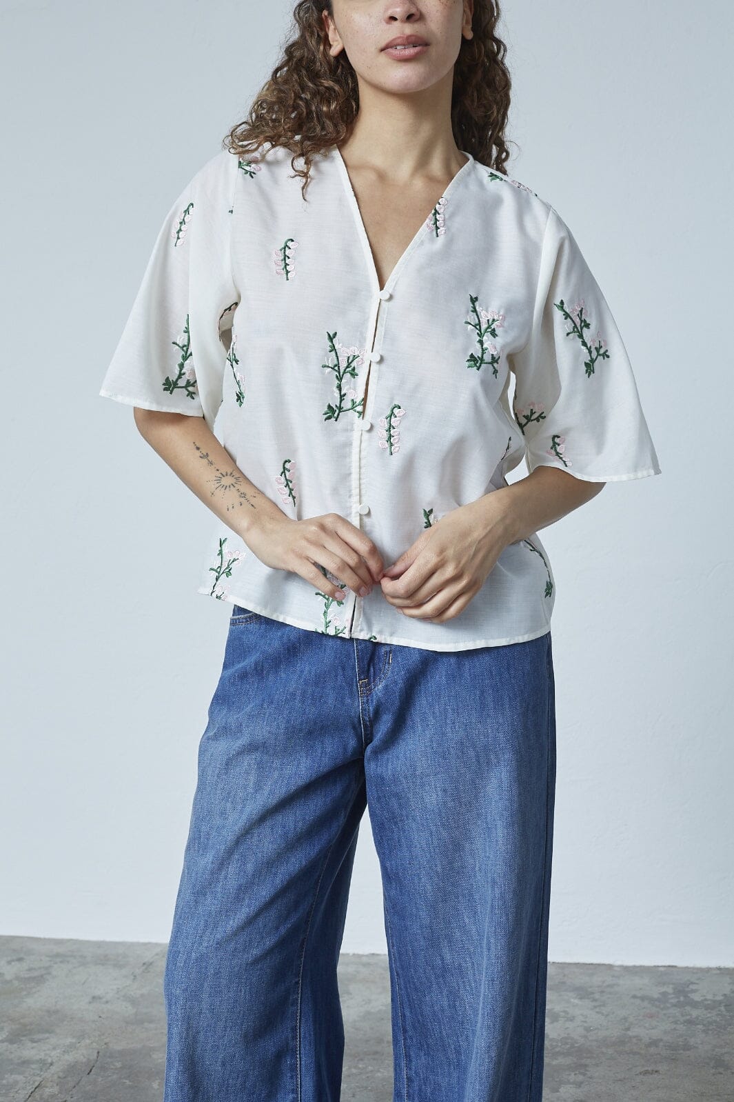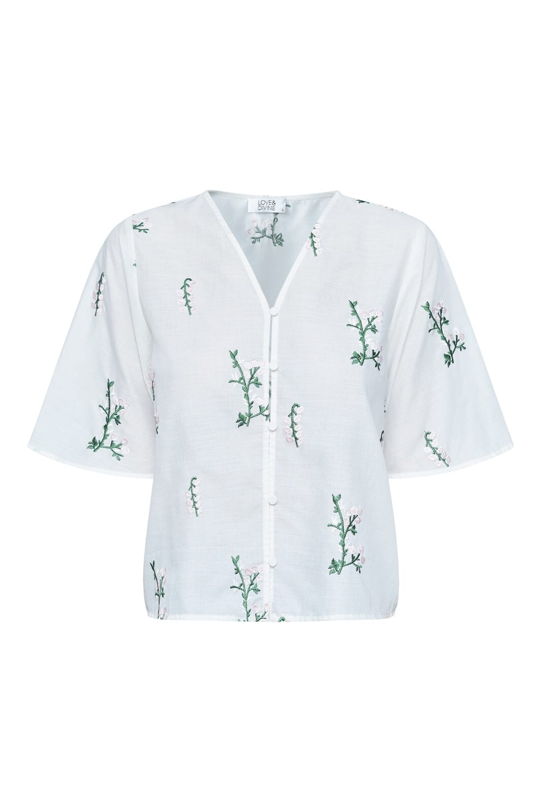 Kreeminvärinen pusero Love & Divine -merkiltä, jossa on brodeerattuja kukkia vaaleanpunaisena ja vihreinä varsina. Puserossa on V-pääntie, nappikiinnitys edessä ja leveät, lyhyet hihat.