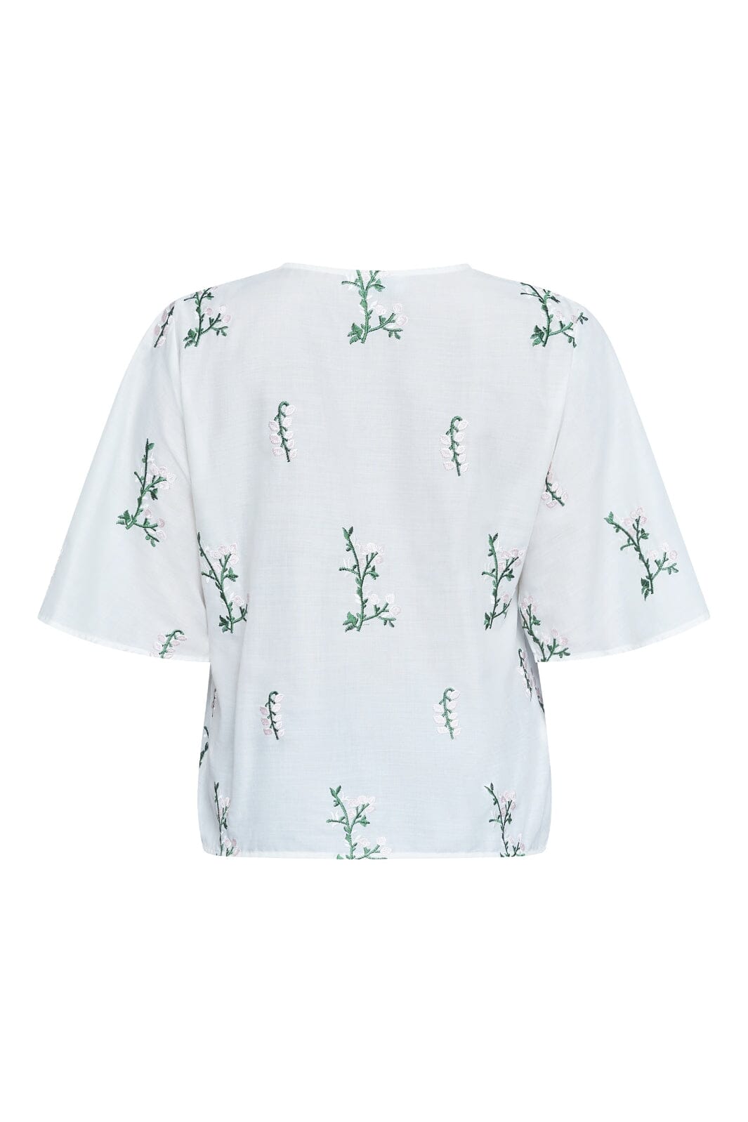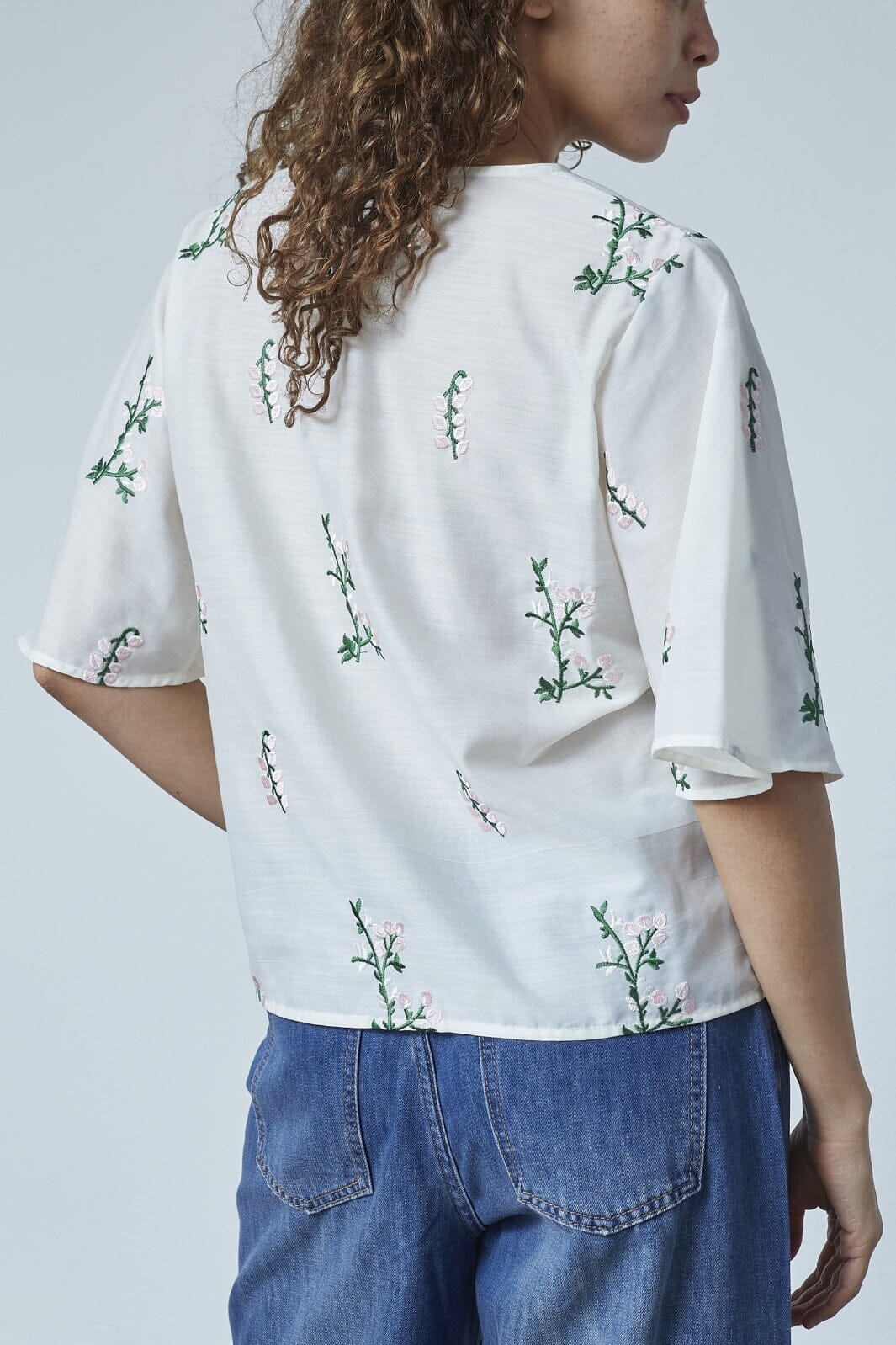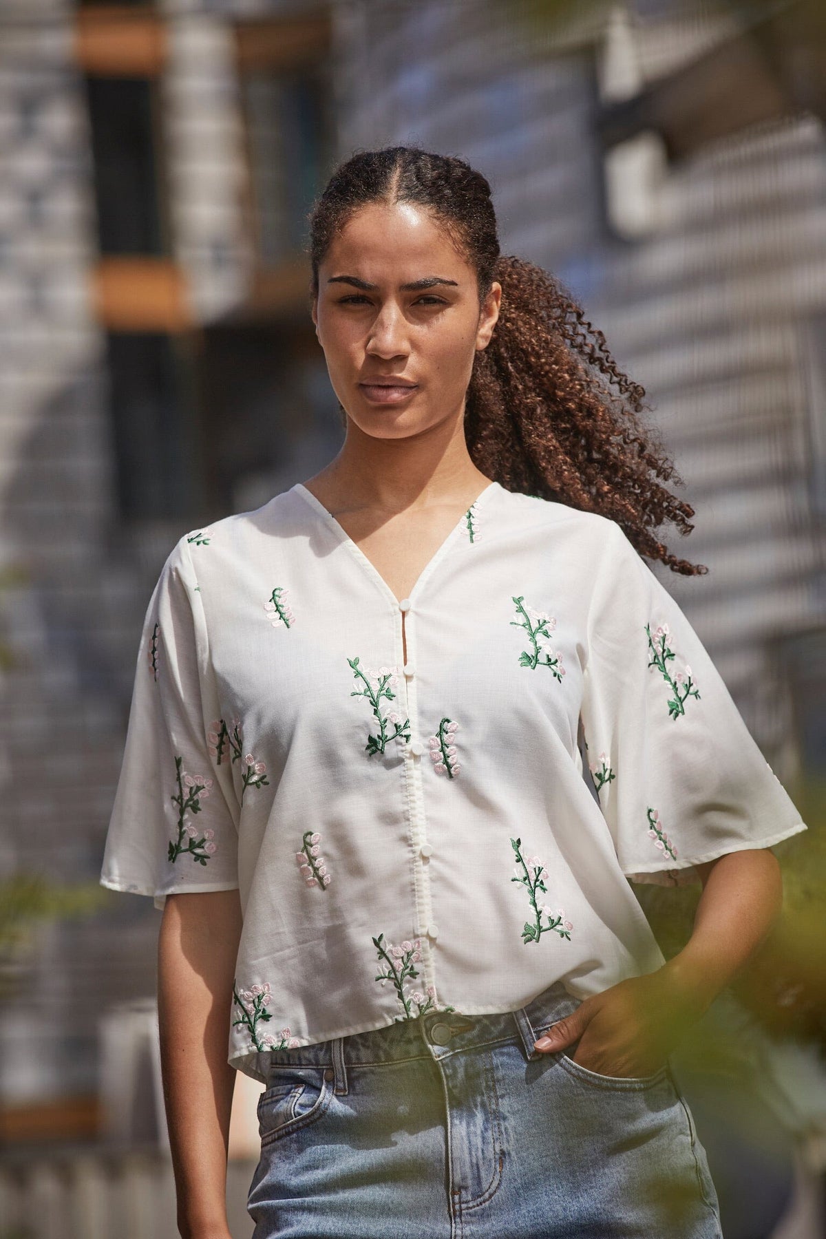 Kreeminvärinen pusero Love & Divine -merkiltä, jossa on brodeerattuja kukkia vaaleanpunaisena ja vihreinä varsina. Puserossa on V-pääntie, nappikiinnitys edessä ja leveät, lyhyet hihat.