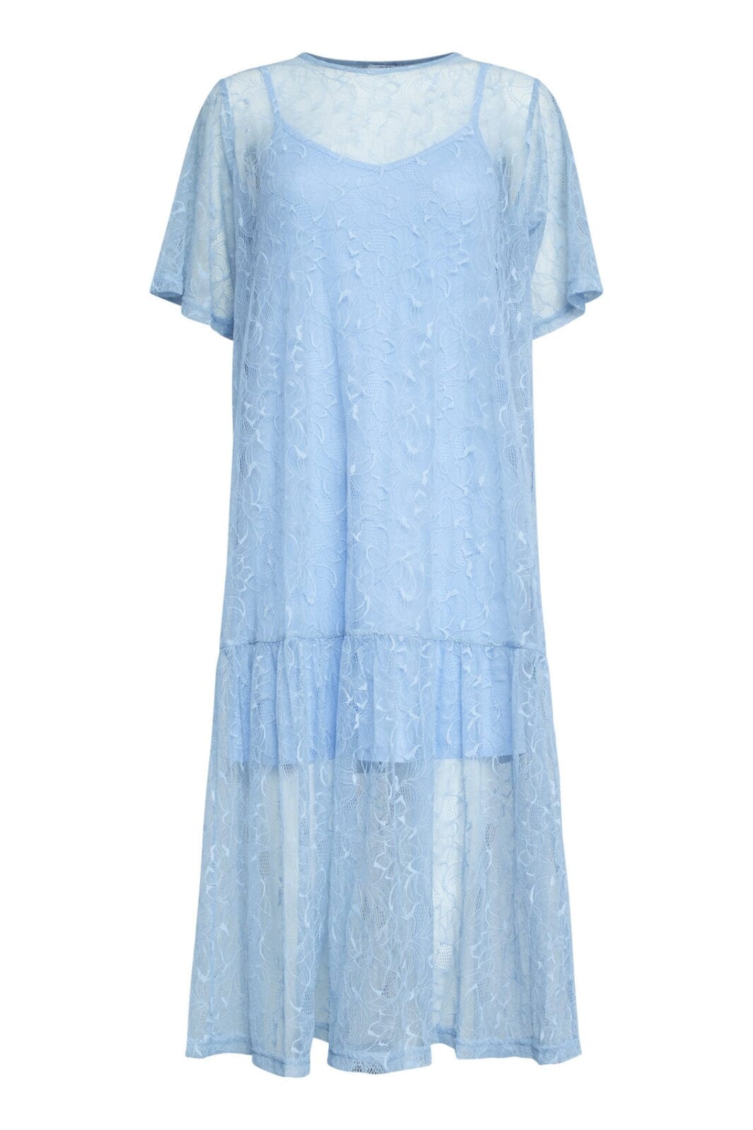 Vaaleansininen pitsimekko Love & Divine -merkkiltä, jossa on löysä malli ja kerroksellinen muotoilu. Mekossa on kukkakuvioinen pitsikuvio ja se ulottuu säärien keskikohtaan.