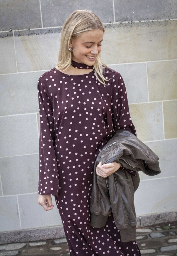 Pitkähihaista mekkoa Love & Divine bordeaux-värissä, jossa on vaaleita pilkkuja. Pitkässä mekossa on pyöreä pääntie ja löysä malli, jossa on halkio sivussa.