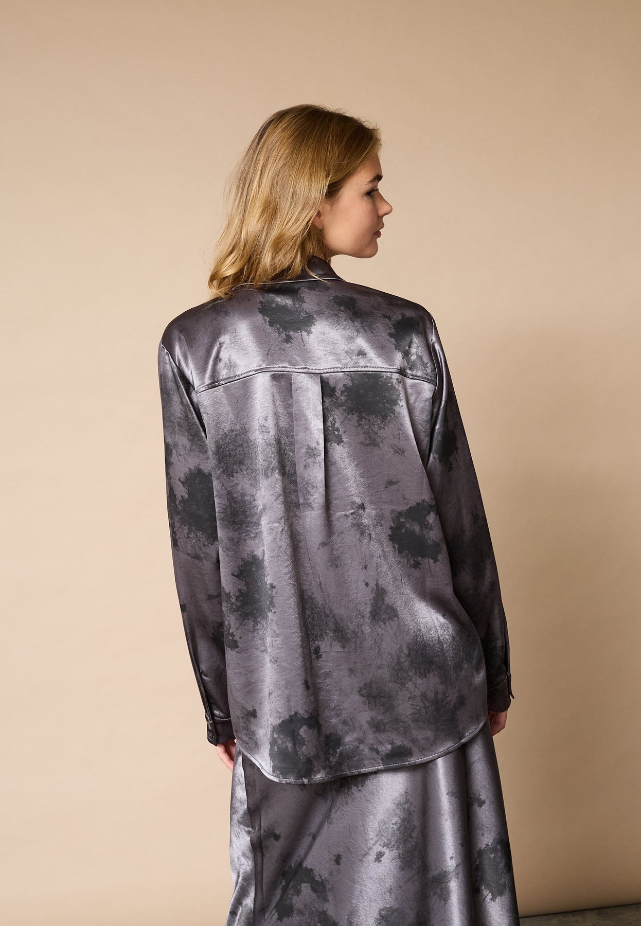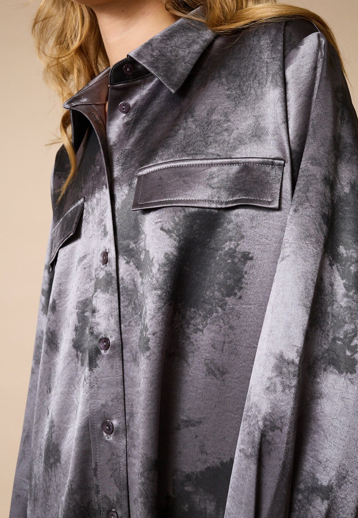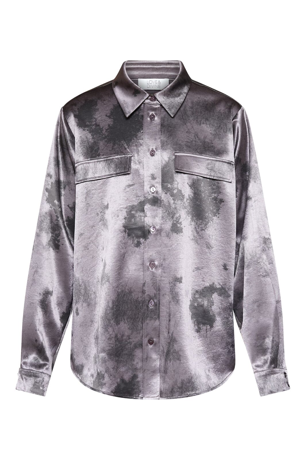 Paita Love & Divine -merkiltä harmaana, kiiltävällä marmoroidulla printillä. Paidassa on oversized-mitoitus ja klassinen paitakaulus.