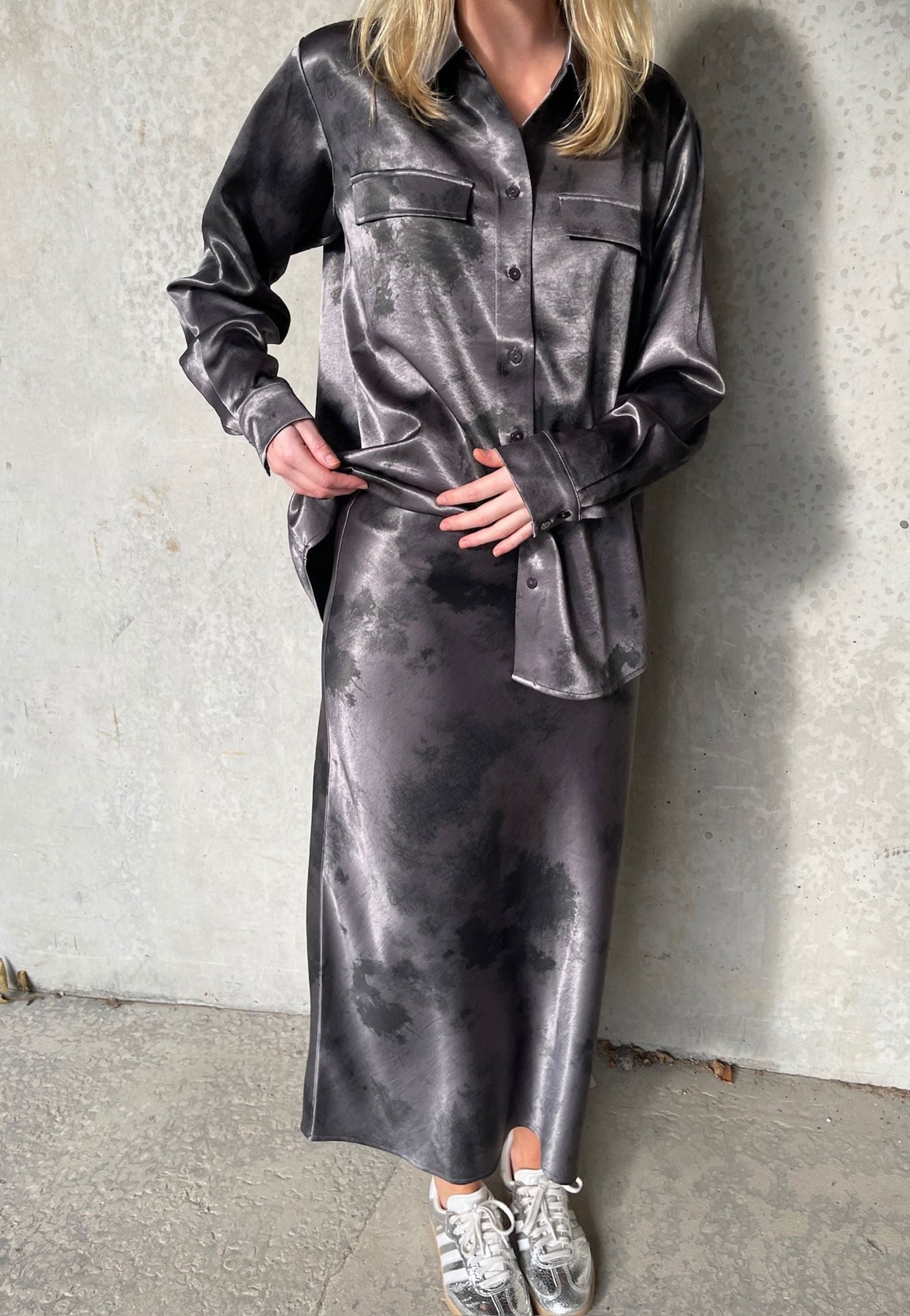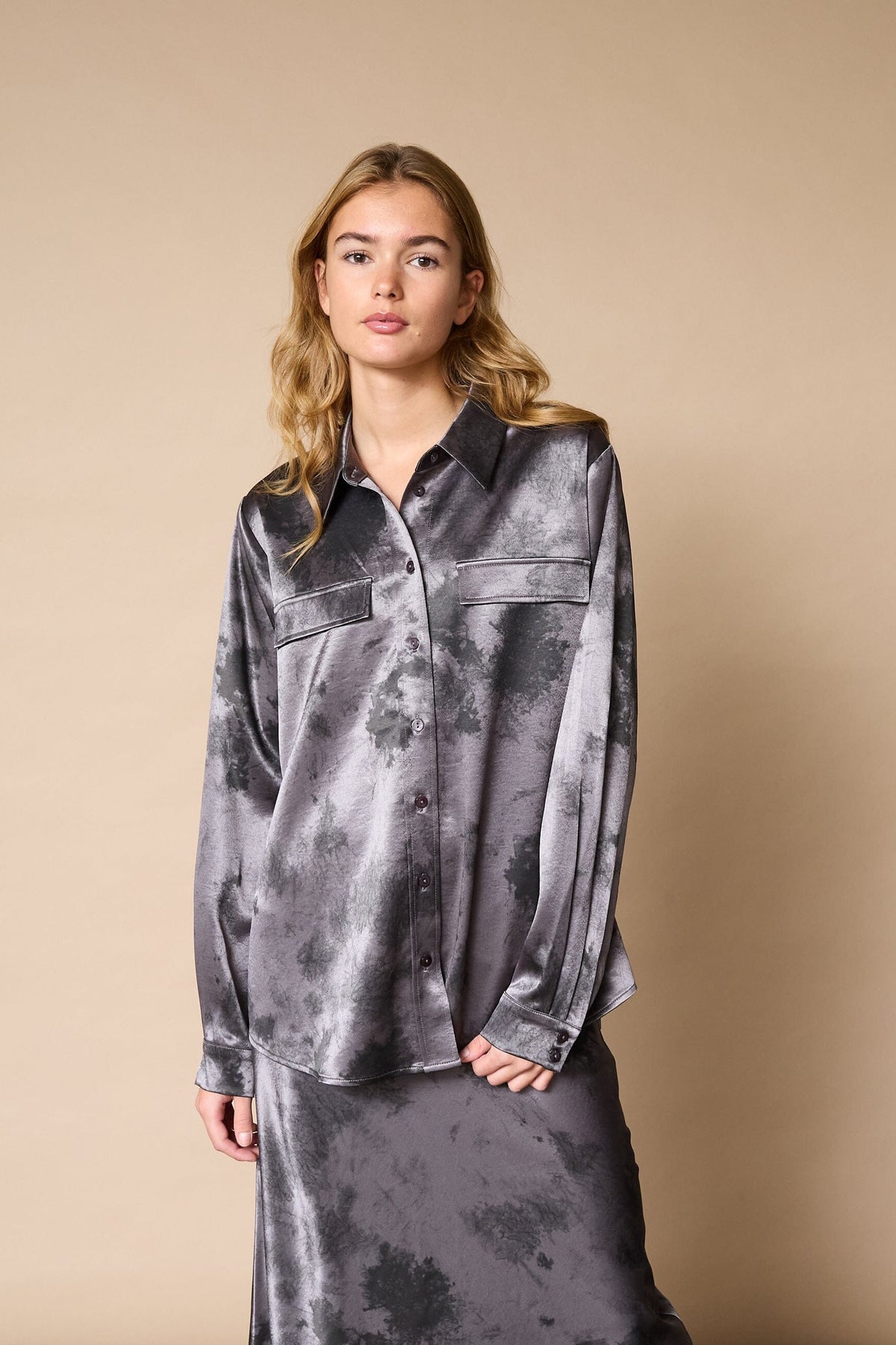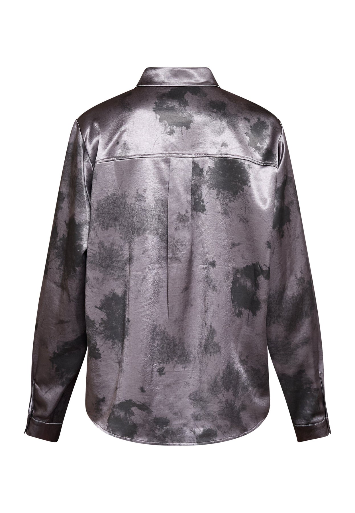 Paita Love & Divine -merkiltä harmaana, kiiltävällä marmoroidulla printillä. Paidassa on oversized-mitoitus ja klassinen paitakaulus.