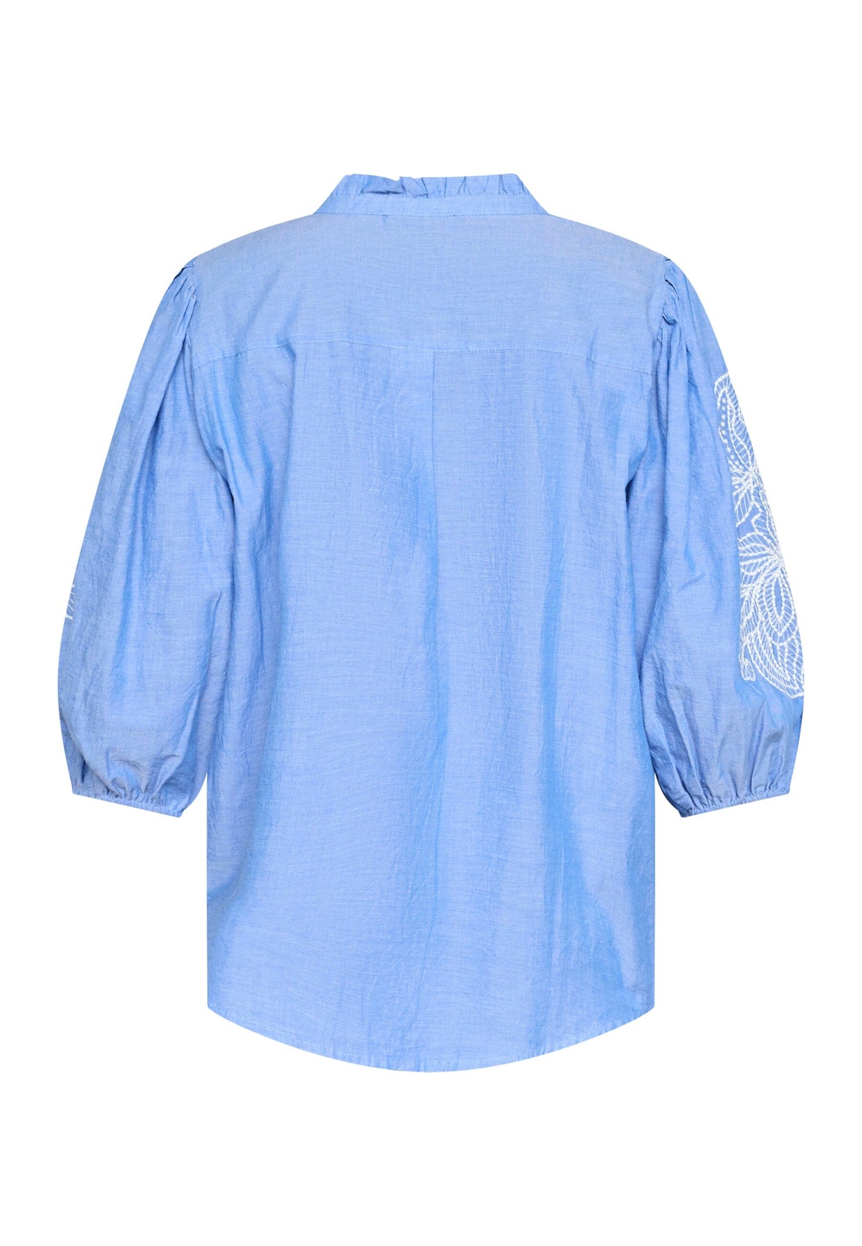 Sininen paita Love & Divinelta, jossa on valkoisia kukkakirjailuja. Paita on valmistettu 100 % puuvillasta ja siinä on väljä istuvuus sekä 3/4-pituiset pussihihat.