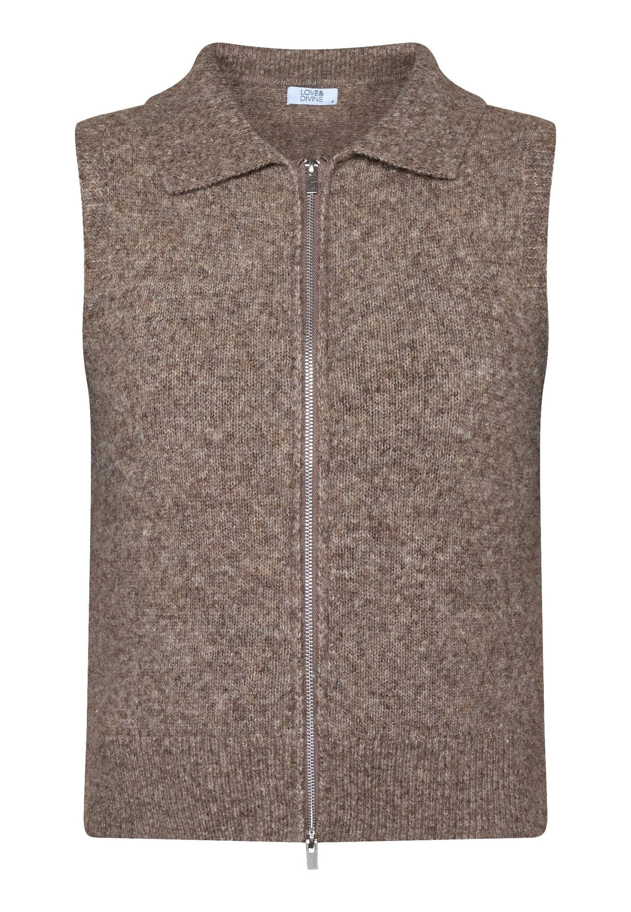 Hihaton neuleliivi Love & Divine -merkiltä ruskeassa meleeratun sävyssä. Liivissä on poolokaulus ja täyspitkä vetoketju edessä.