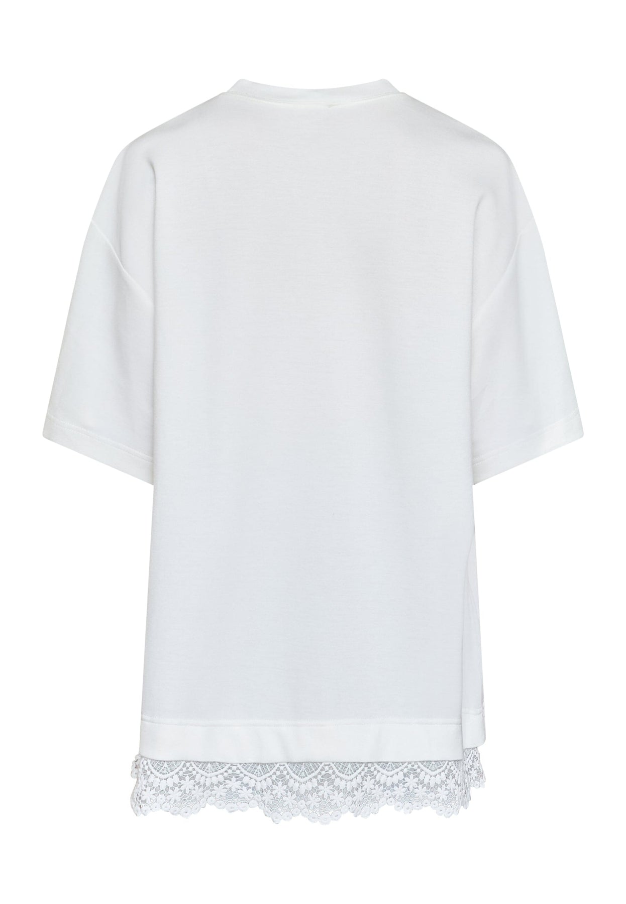 Valkoinen t-paita Love & Divine -merkiltä, jossa on ommeltu pitsireunus alareunassa. Siinä on oversized-istuvuus ja lyhyet hihat.
