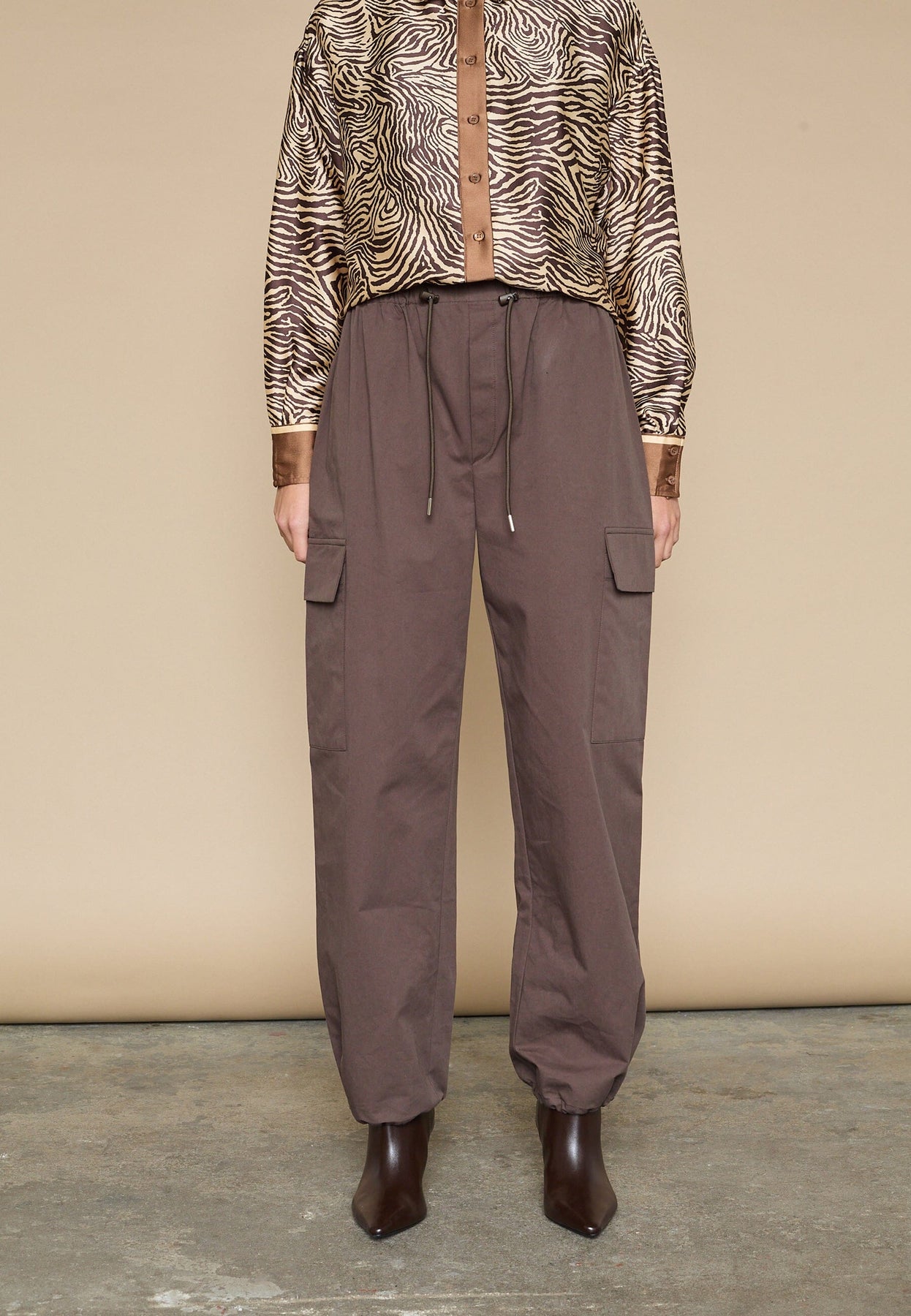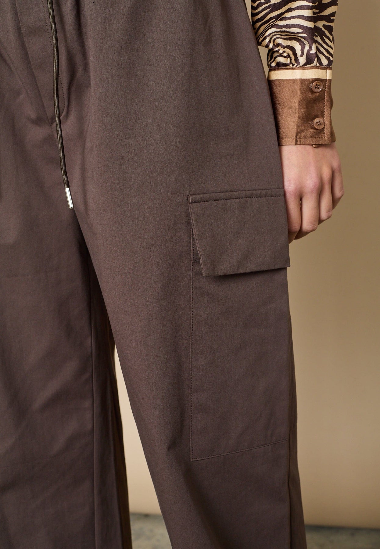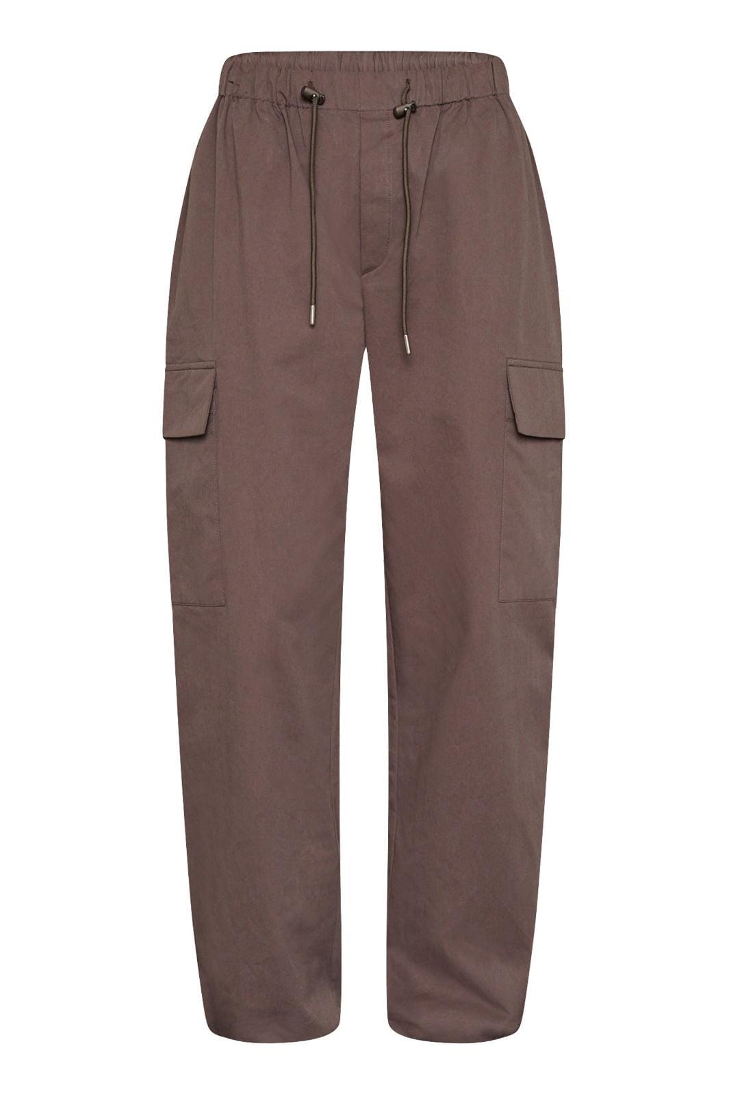 Ruskeat housut Love & Divine -merkiltä, valmistettu 100 % puuvillasta. Housuissa on korkea vyötärö, väljä istuvuus ja pituus ulottuu nilkkoihin.