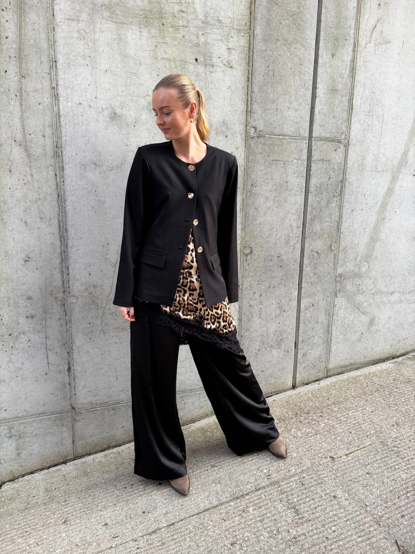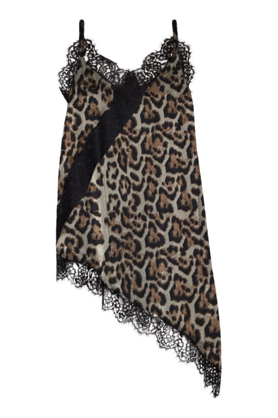 Love & Divine -toppi, jossa on leopardikuvio ruskean ja beigen sävyissä mustalla taustalla. Topissa on pitsireunat ja epäsymmetrinen malli vinolla helmalla.
