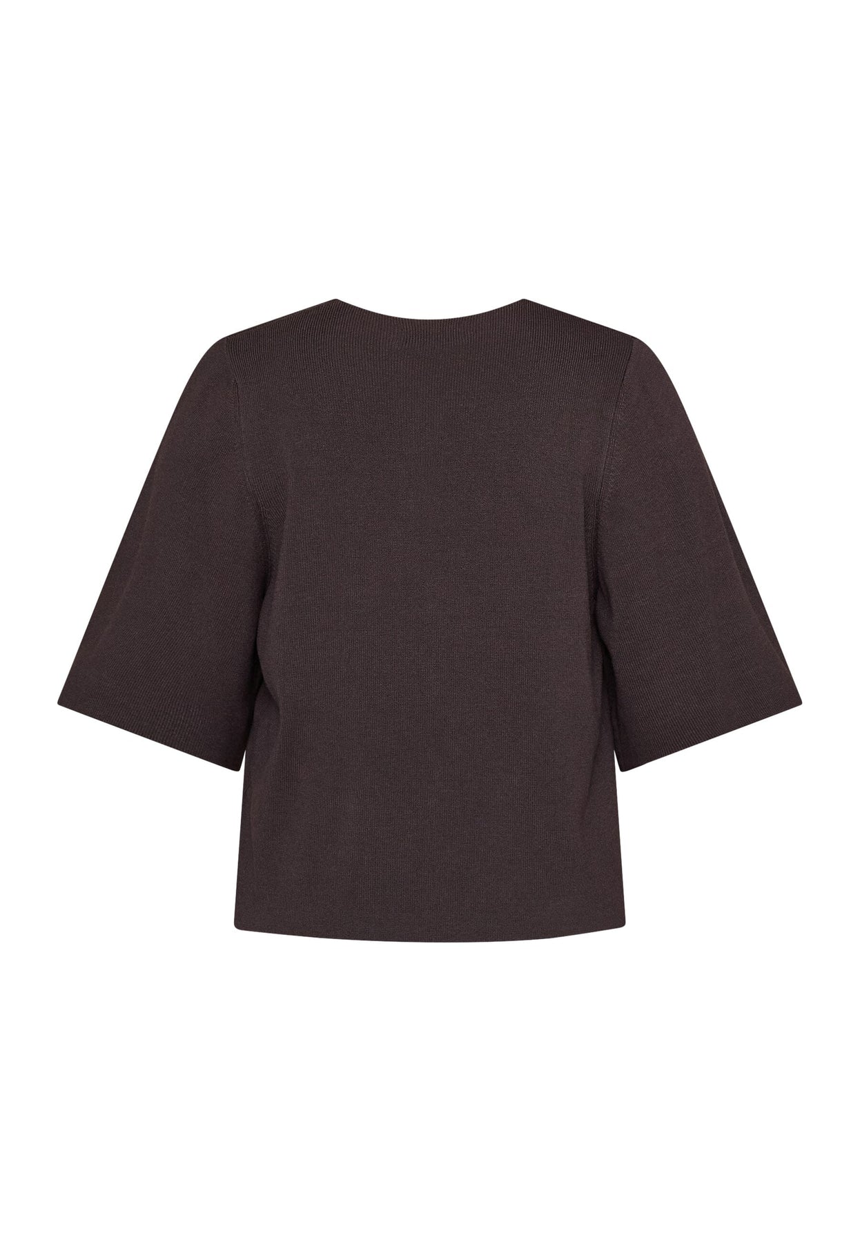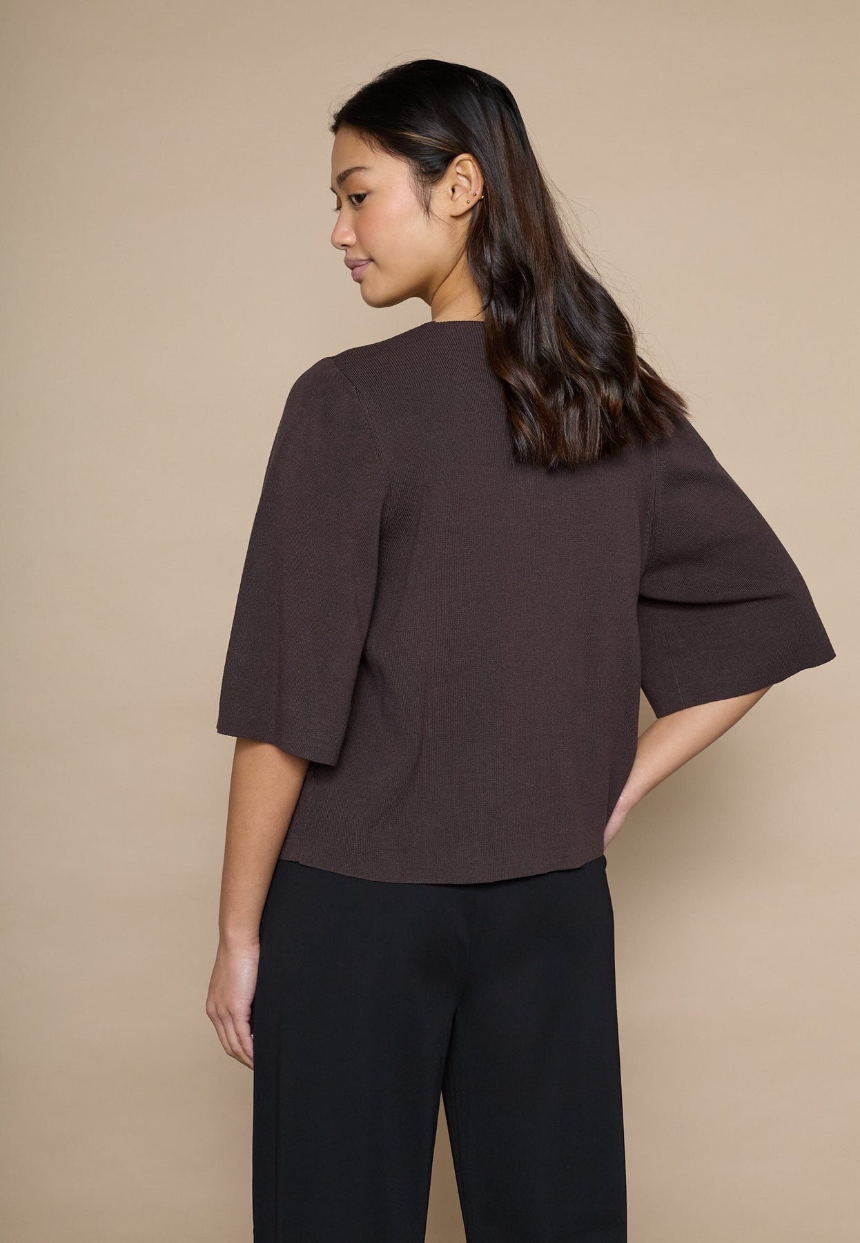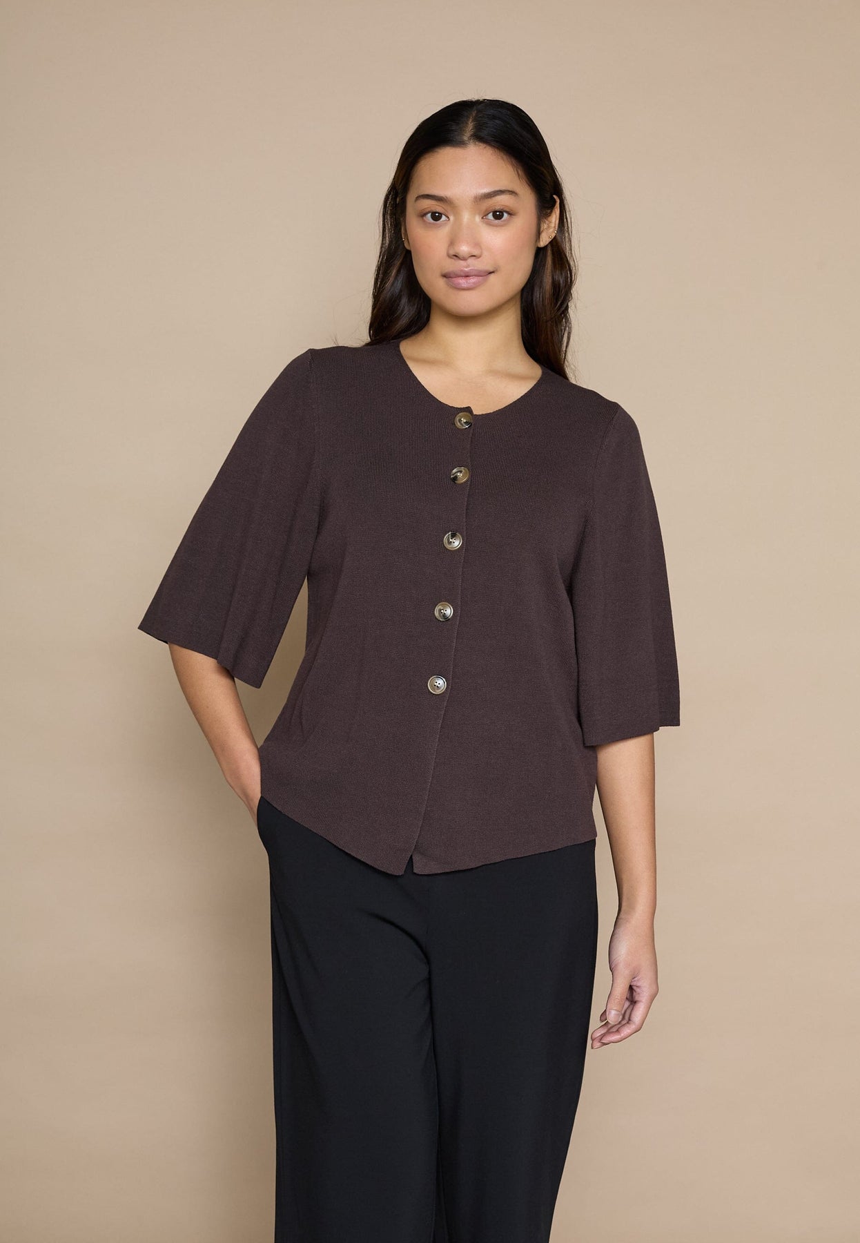 Neulottu toppi Love & Divinelta ruskeassa sävyssä. Siinä on pyöreä pääntie, läpikäyvä nappikiinnitys ja kolmivartiset hihat kellomaisella leikkauksella.