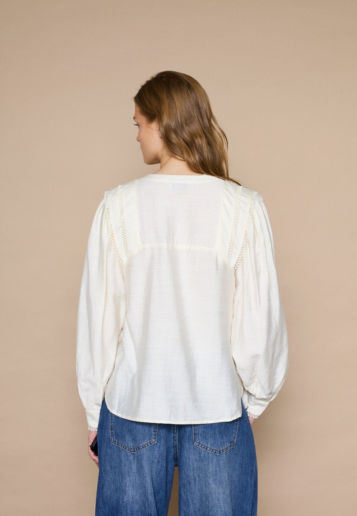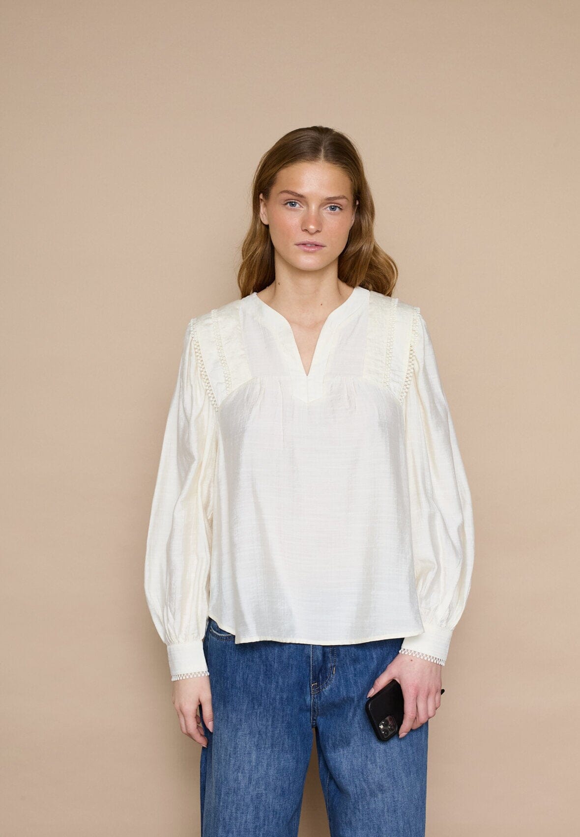 Kermanvärinen pusero Love & Divinelta, rennolla istuvuudella ja pitkissä hihoissa. Puserossa on V-pääntie sekä koristeelliset röyhelöyksityiskohdat olkapäillä ja hihansuissa.
