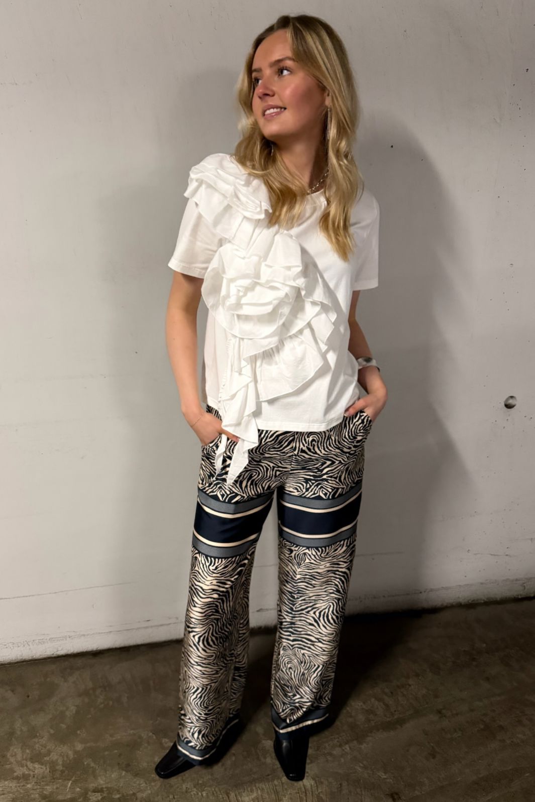 Valkoinen T-paita Love & Divine -merkiltä, epäsymmetrisellä designilla. Toppi on koristeltu suurilla, runsasmuotoisilla röyhelöillä toisen olkapään ja rinnan yli.