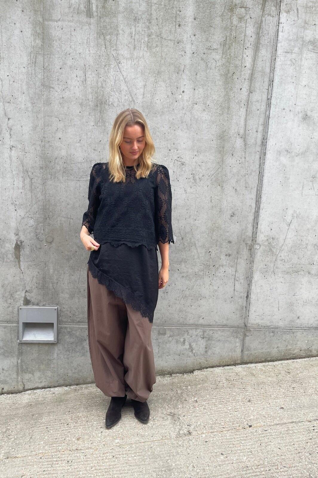 Musta pitsipusero Love & Divine -merkiltä, valmistettu 100 % polyesteristä, jossa on kukkakuvioinen pitsidesign ja kolmen neljäsosan pituiset hihat pitsikuviolla.