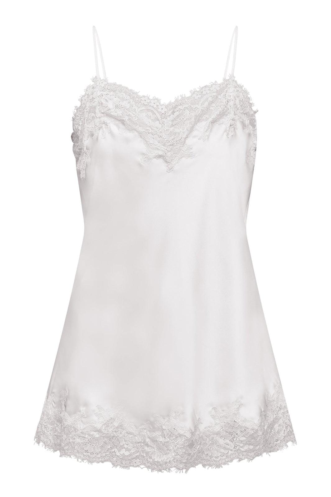 Valkoinen toppi Love & Divine -merkiltä, jossa on ohuet olkaimet sekä pitsiyksityiskohtia pääntiellä ja helmassa.