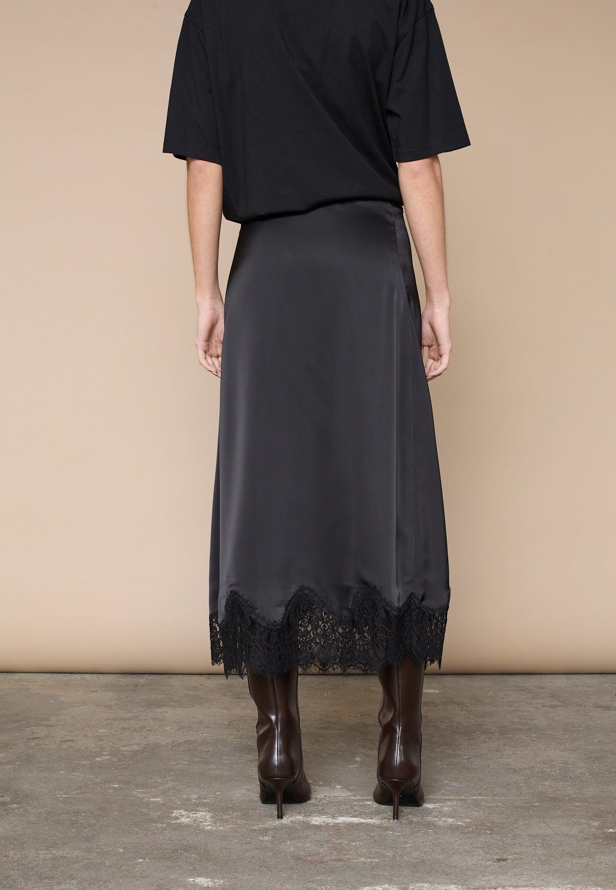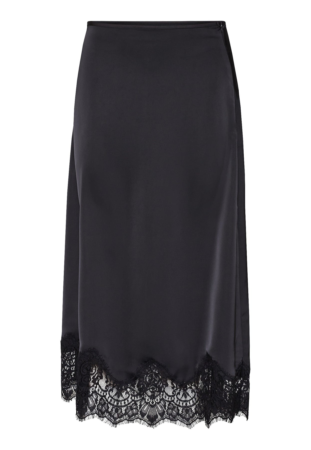 Musta Love & Divine -hame, jossa on pitsiä helmassa. Hameessa on sileä pinta ja kevyesti kiiltävä viimeistely, ja pituus ulottuu pohkeen puoliväliin.