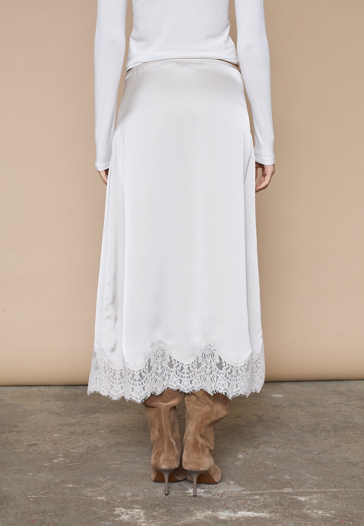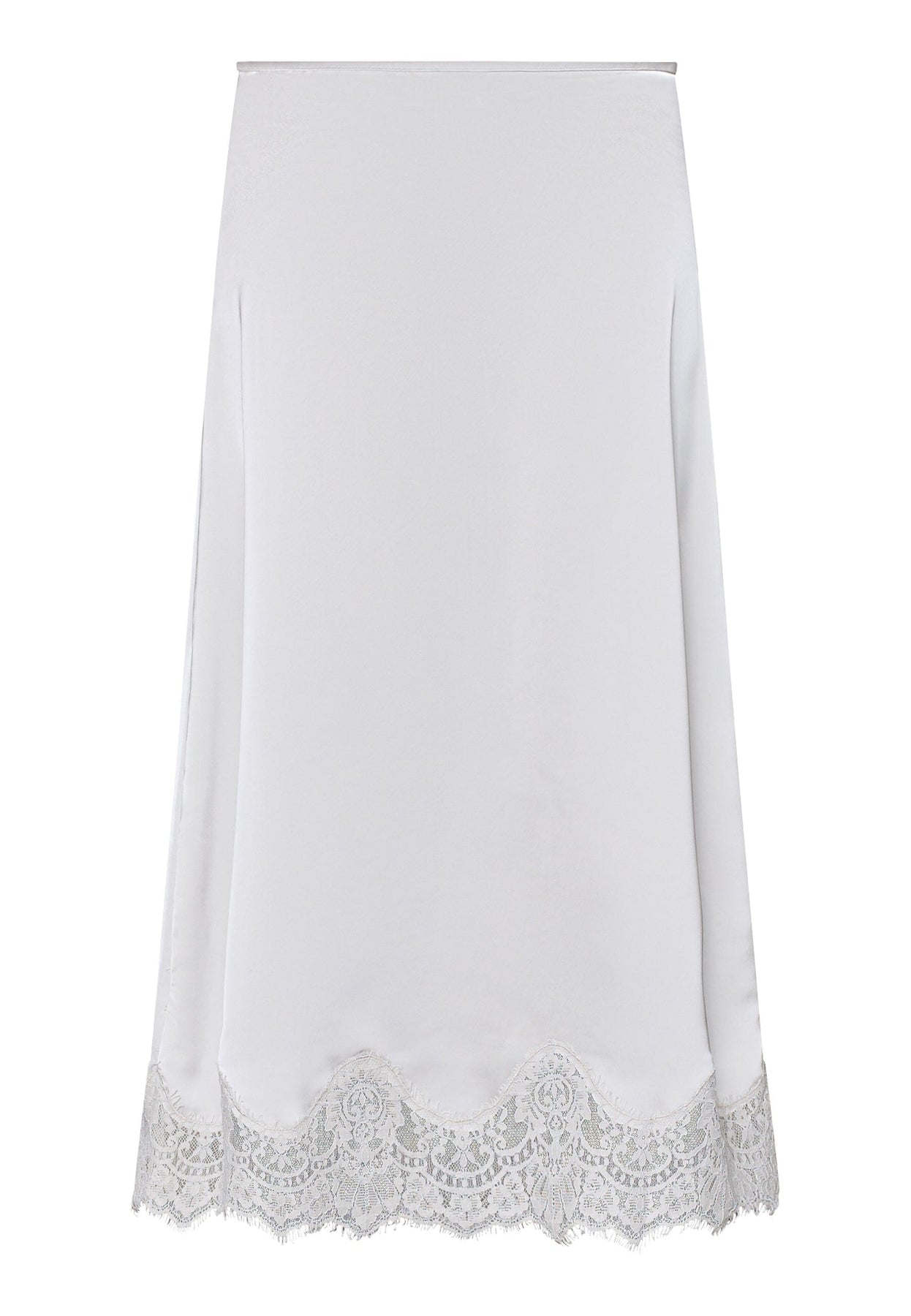 Love & Divine -merkin pitkä hame valkoisen ja kerman sävyissä. Hameessa on sileä ja kiiltävä pinta sekä pitsireunus helmassa.