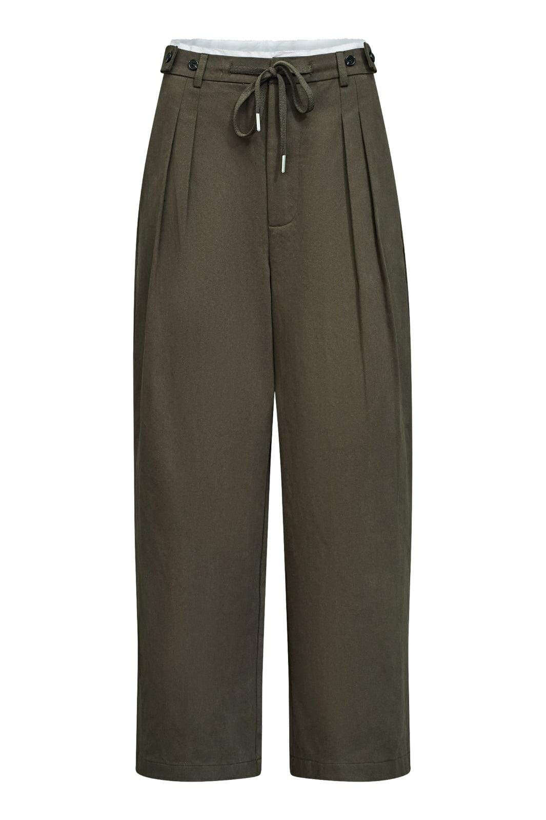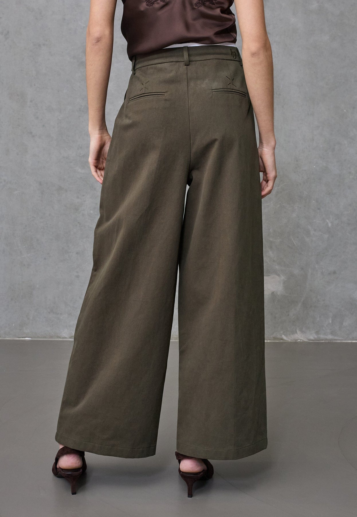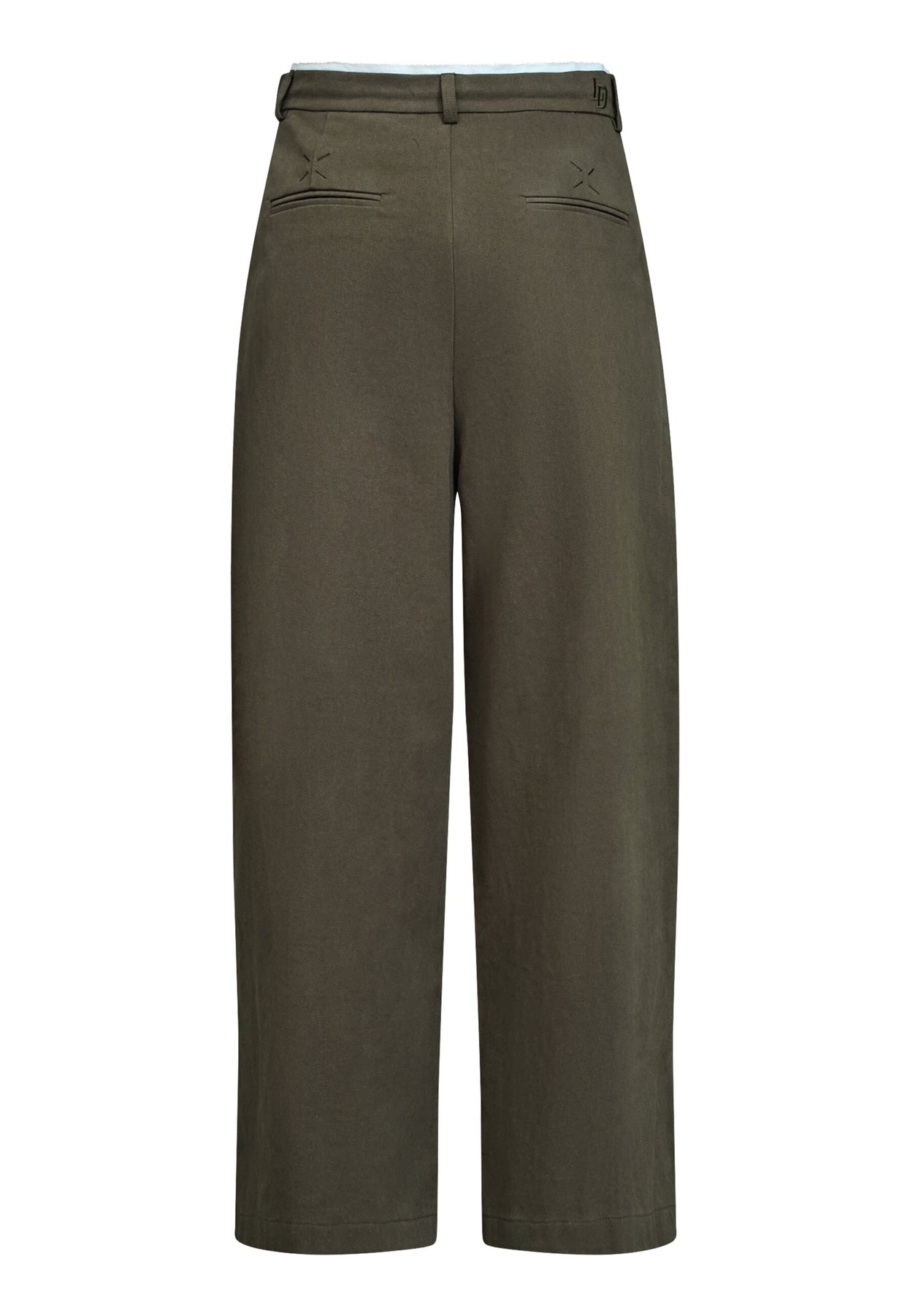 Ruskeat housut Love & Divine -merkiltä, puuvillaa, leveällä istuvuudella ja koristeellisilla yksityiskohdilla. Housuissa on korkea vyötärö ja pituus ulottuu pohkeen puoliväliin.
