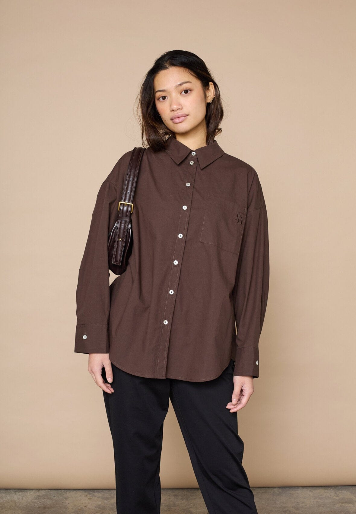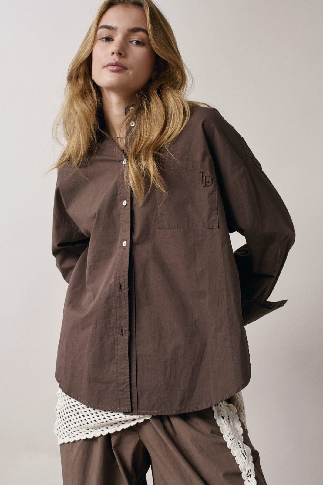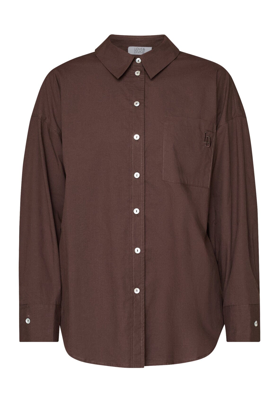 Ruskea Love & Divine -paita, jossa on kirjailu rintataskussa. Paidassa on oversized-istuvuus, pitkät hihat ja nappikiinnitys edessä.