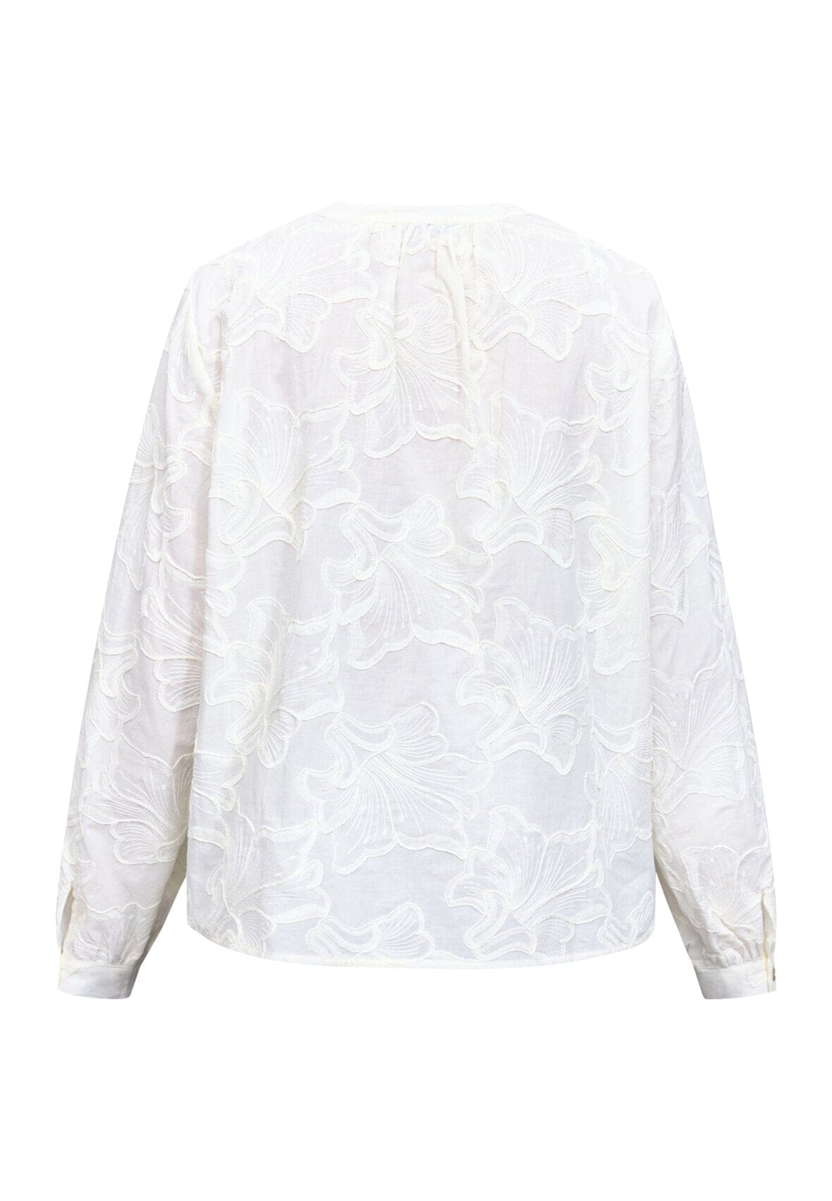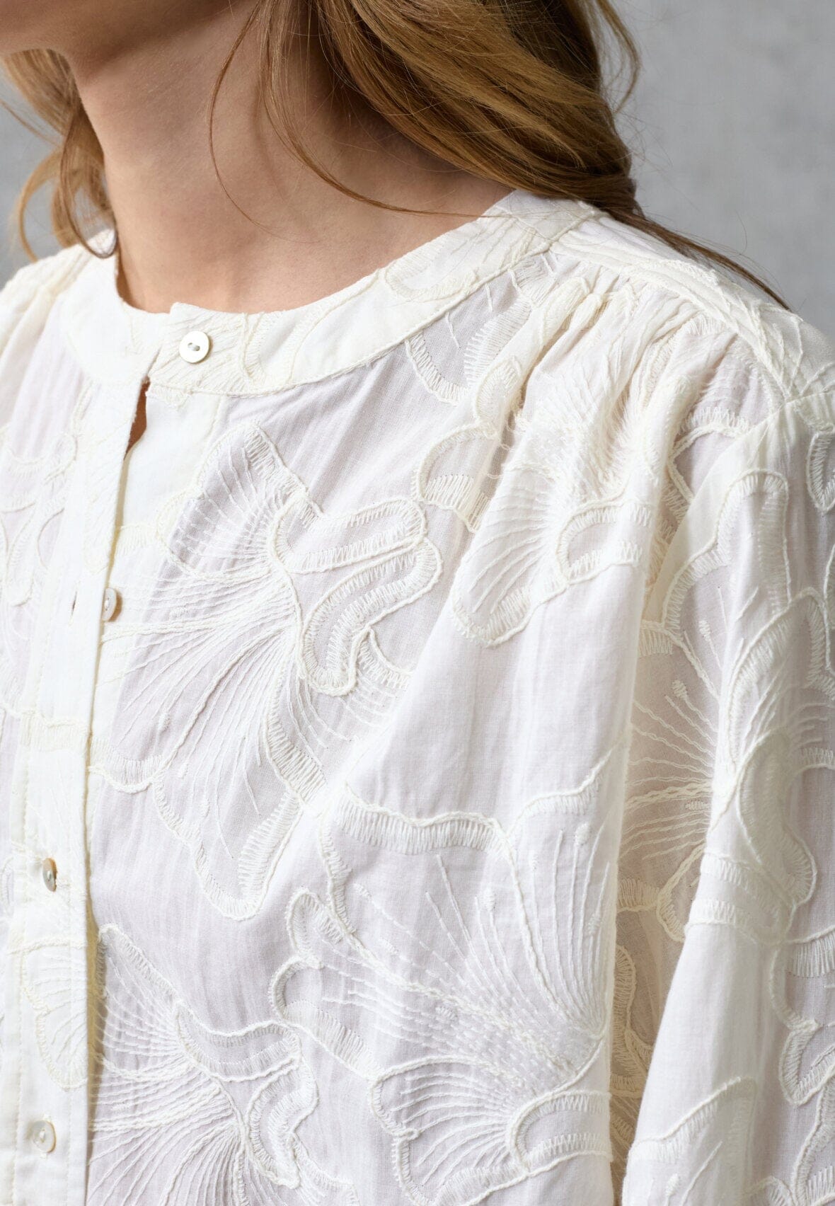 Kermanvalkoinen paita Love & Divine -merkiltä, jossa on kirjailtu kukkakuvio. Paidassa on läpiknapitettava etuosa ja väljä istuvuus.