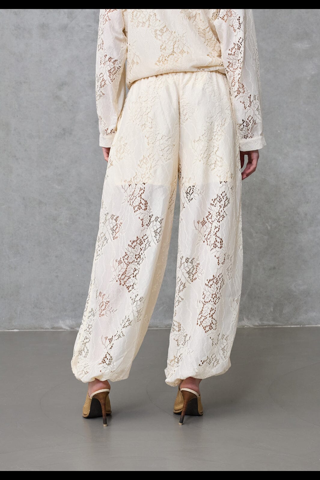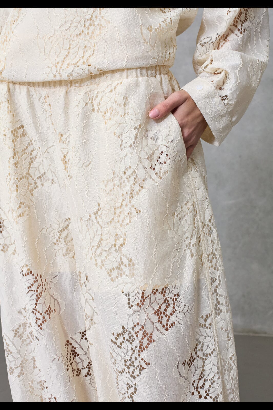 Love & Divine -merkin housut kermanvärisenä. Valmistettu pitsistä, jossa on kiinni ommellut shortsit. Housuissa on väljä istuvuus ja joustava vyötärö.