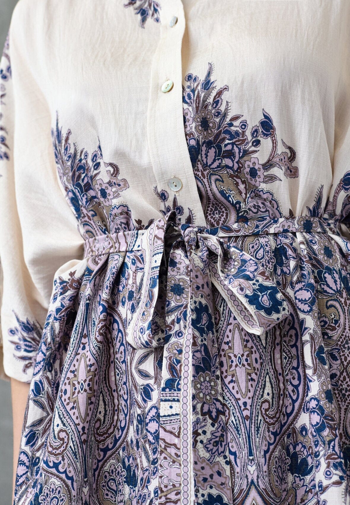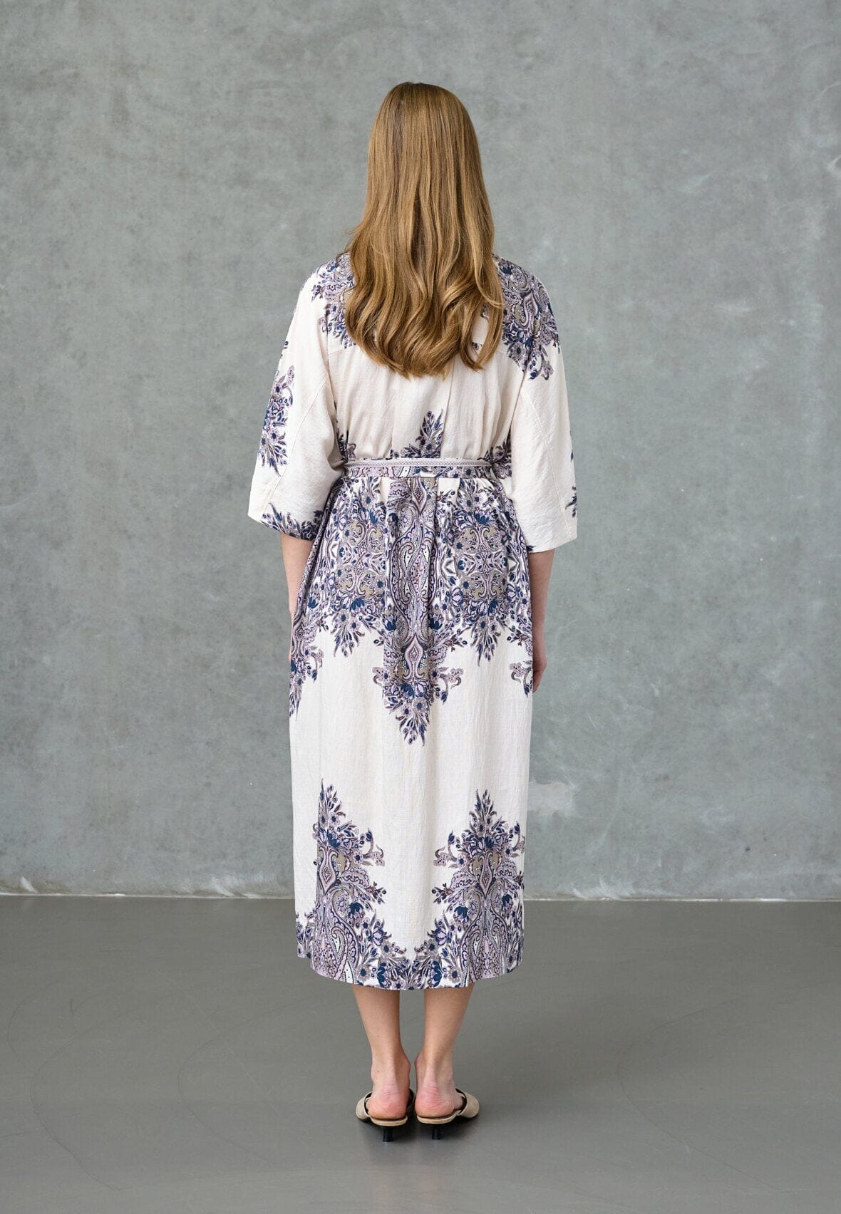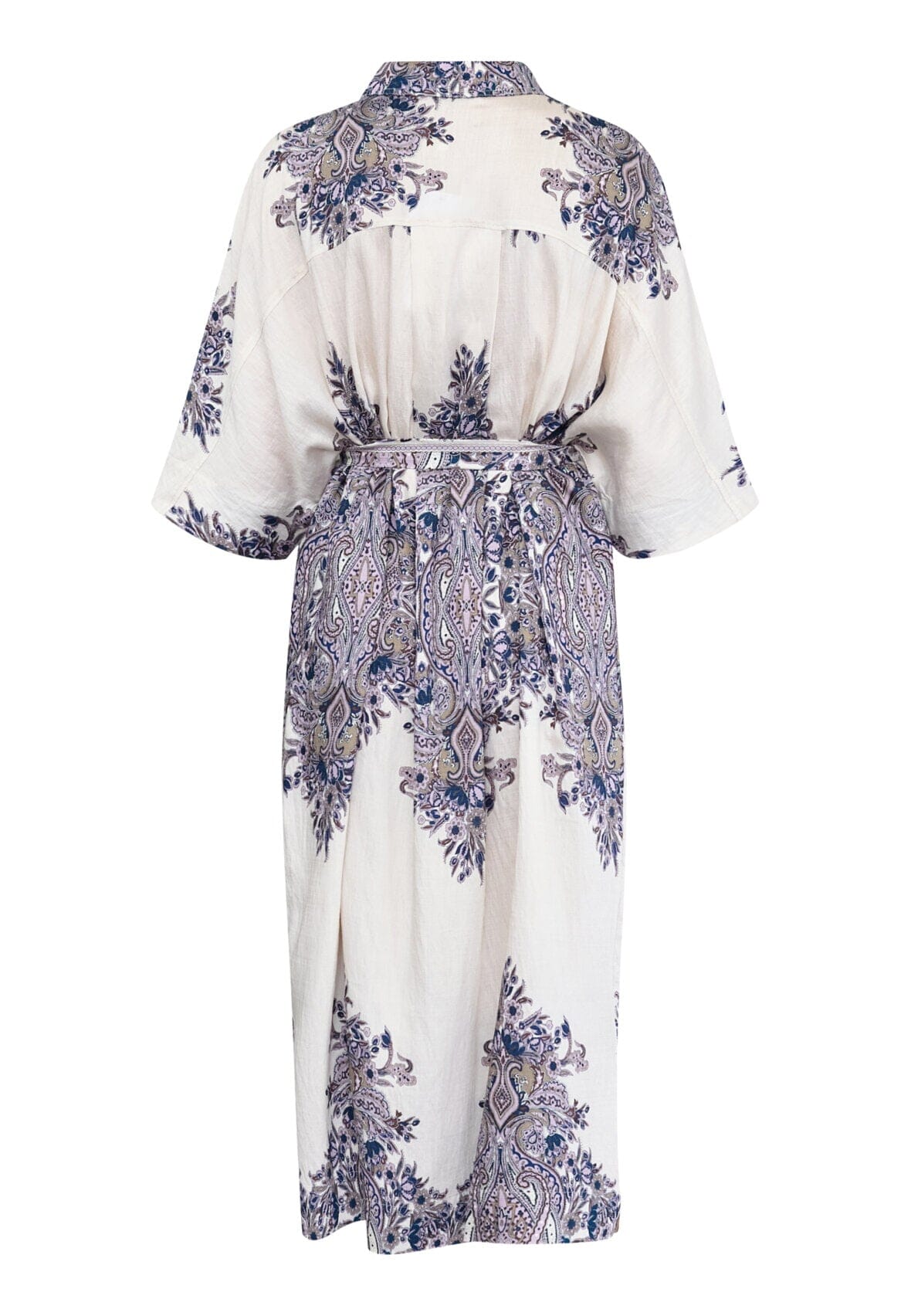 Mekko Love & Divine -merkiltä kerman- ja valkoisena, samppanjan- ja sinisävyisellä paisley-kuviolla. Mekossa on nappikiinnitys edessä ja 3/4-hihat.