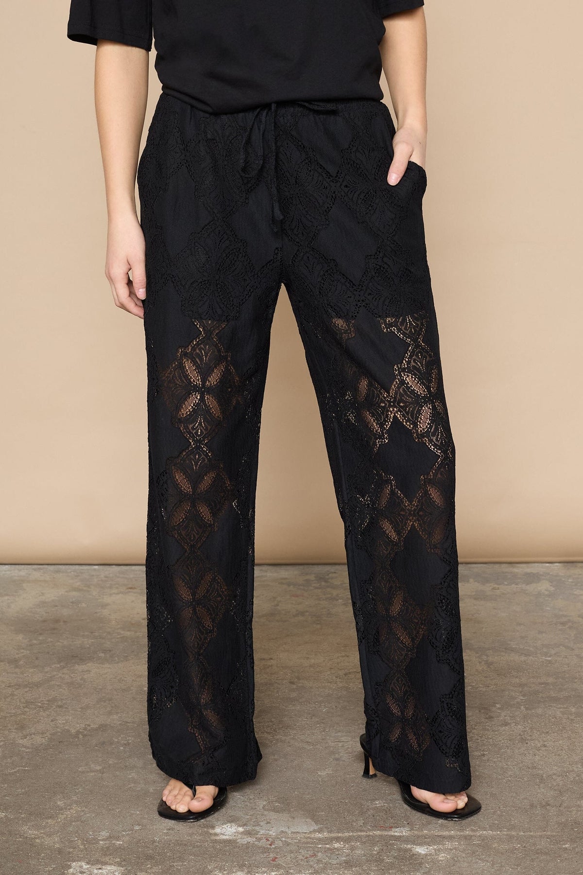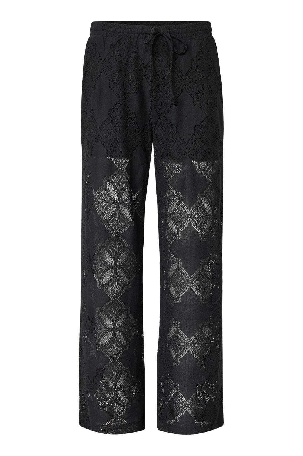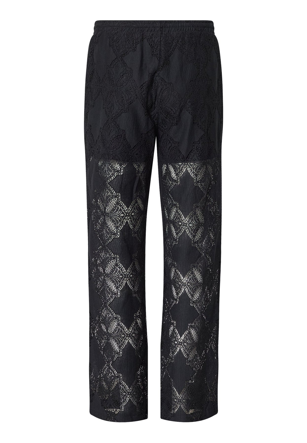 Mustat Love & Divine -housut, joissa on läpikuultava pitsikuvio. Housuissa on normaali vyötärönkorkeus ja ne ulottuvat nilkkaan.