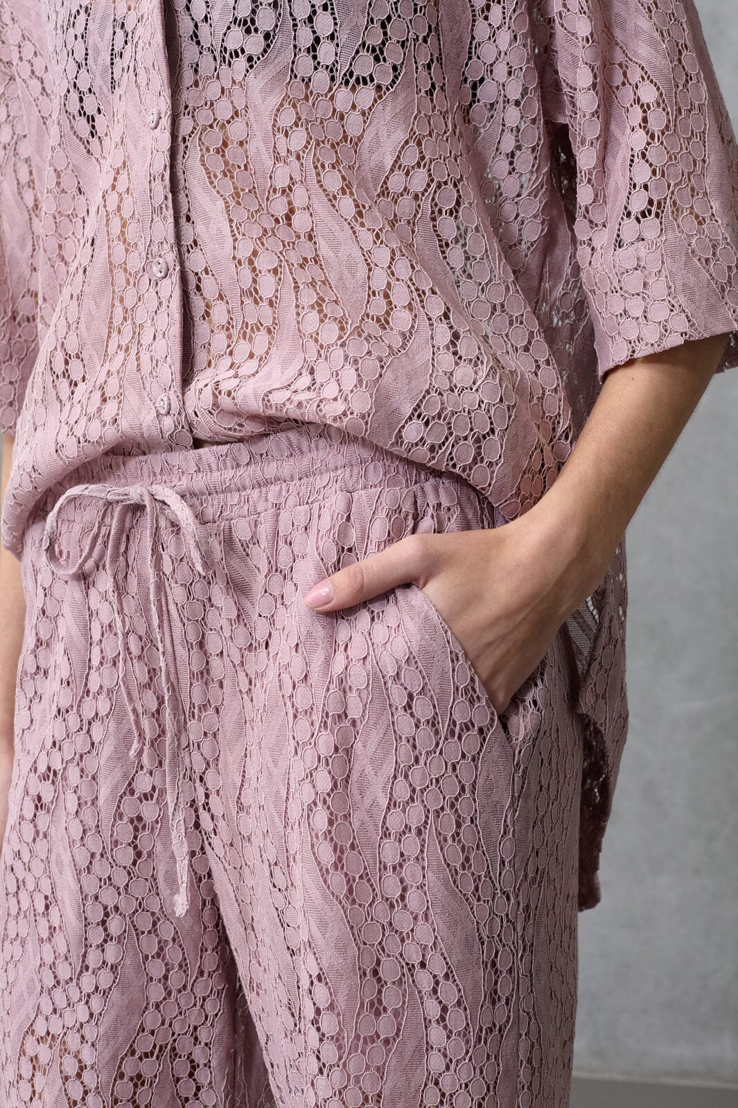 Violetit pitsihousut Love & Divine -merkiltä pitsikankaasta. Housuissa on väljä istuvuus ja joustava vyötärö kiristysnyörillä.