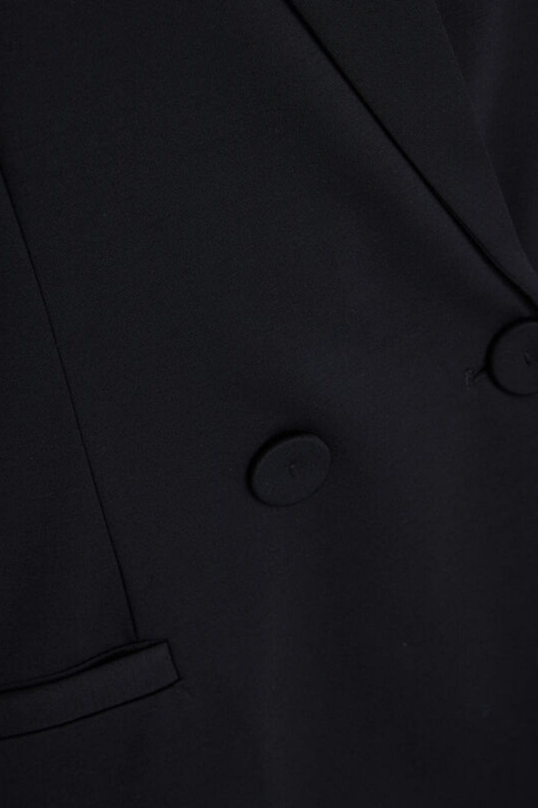 Musta bleiseri käänteillä ja kaksipainonappikiinnityksellä. Bleiserissä on puhdas siluetti, jossa on kaksi käytännöllistä etutaskua ja pitkät hihat. Klassinen muotoilu tekee siitä sopivan muodollisiin tilaisuuksiin.