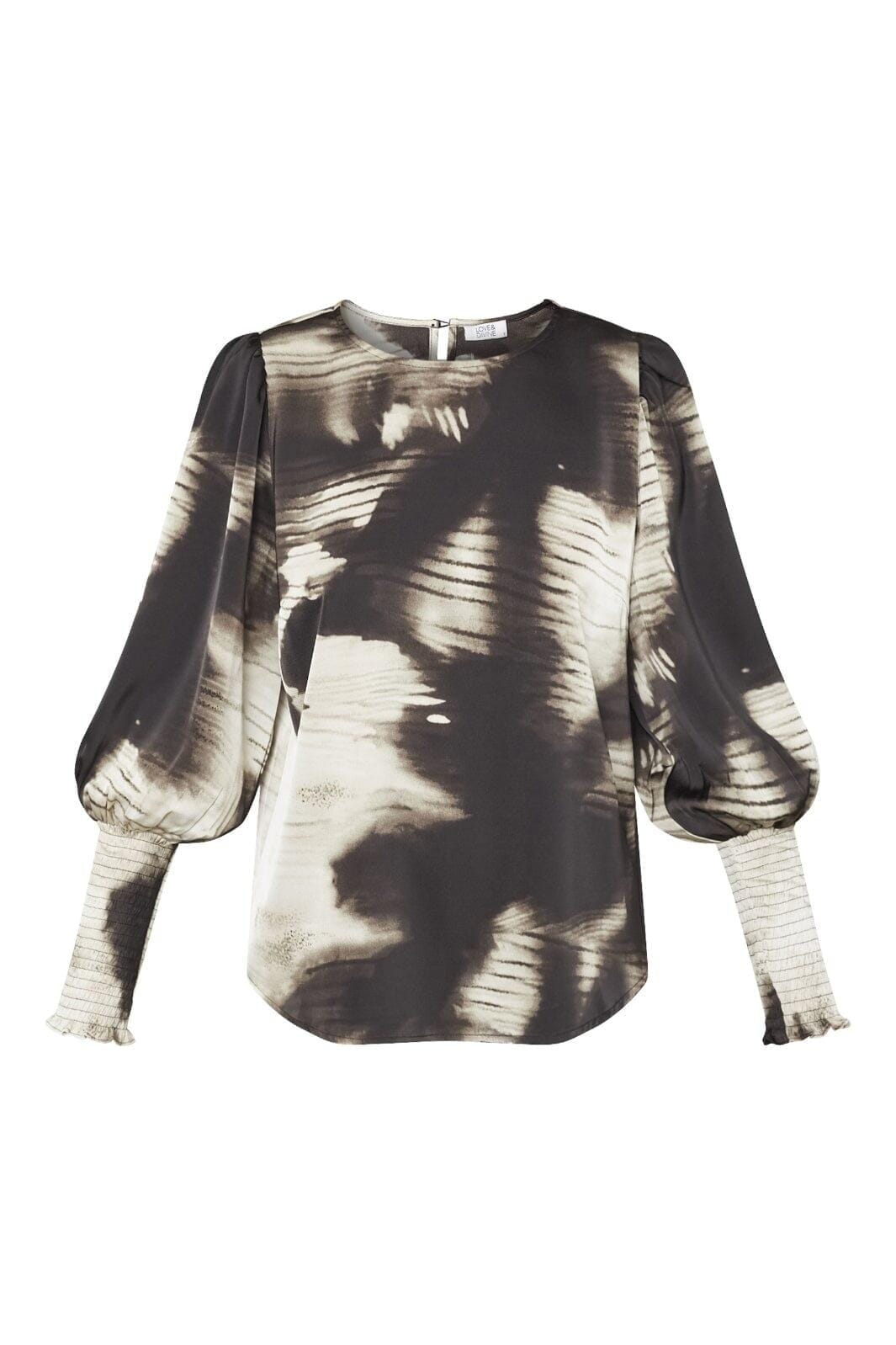 Love & Divine -pusero, jossa on graafinen printti mustan, kerman ja valkoisen sävyissä. Puserossa on pitkät hihat ja väljä istuvuus.