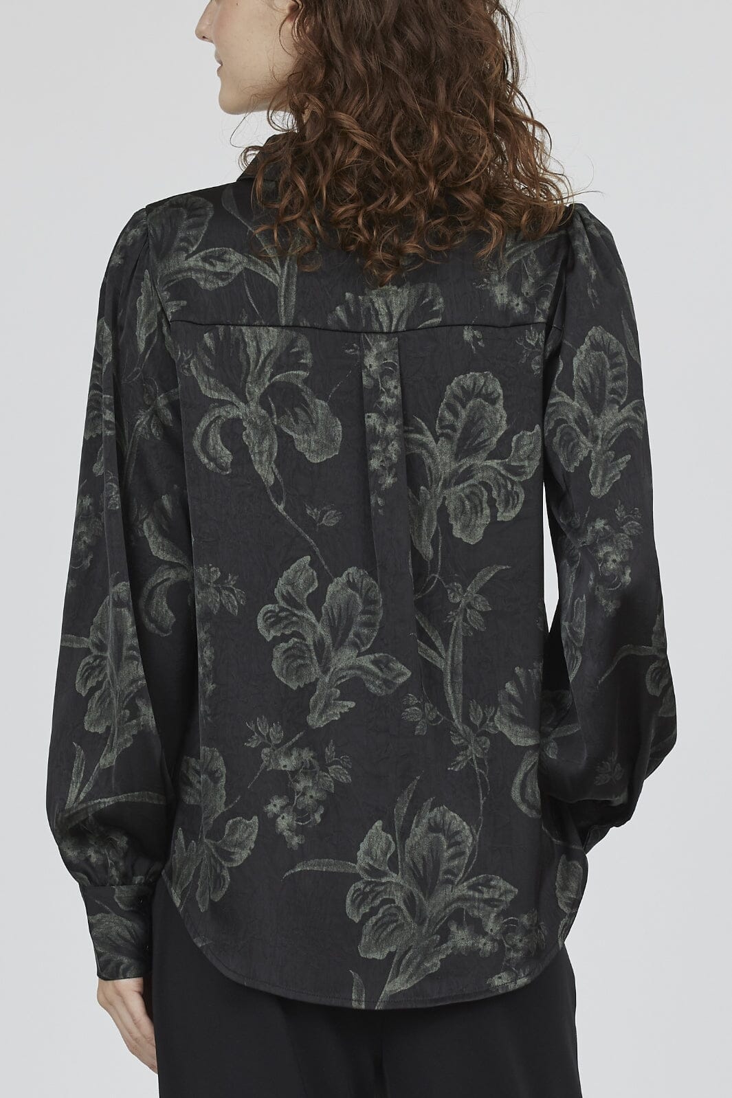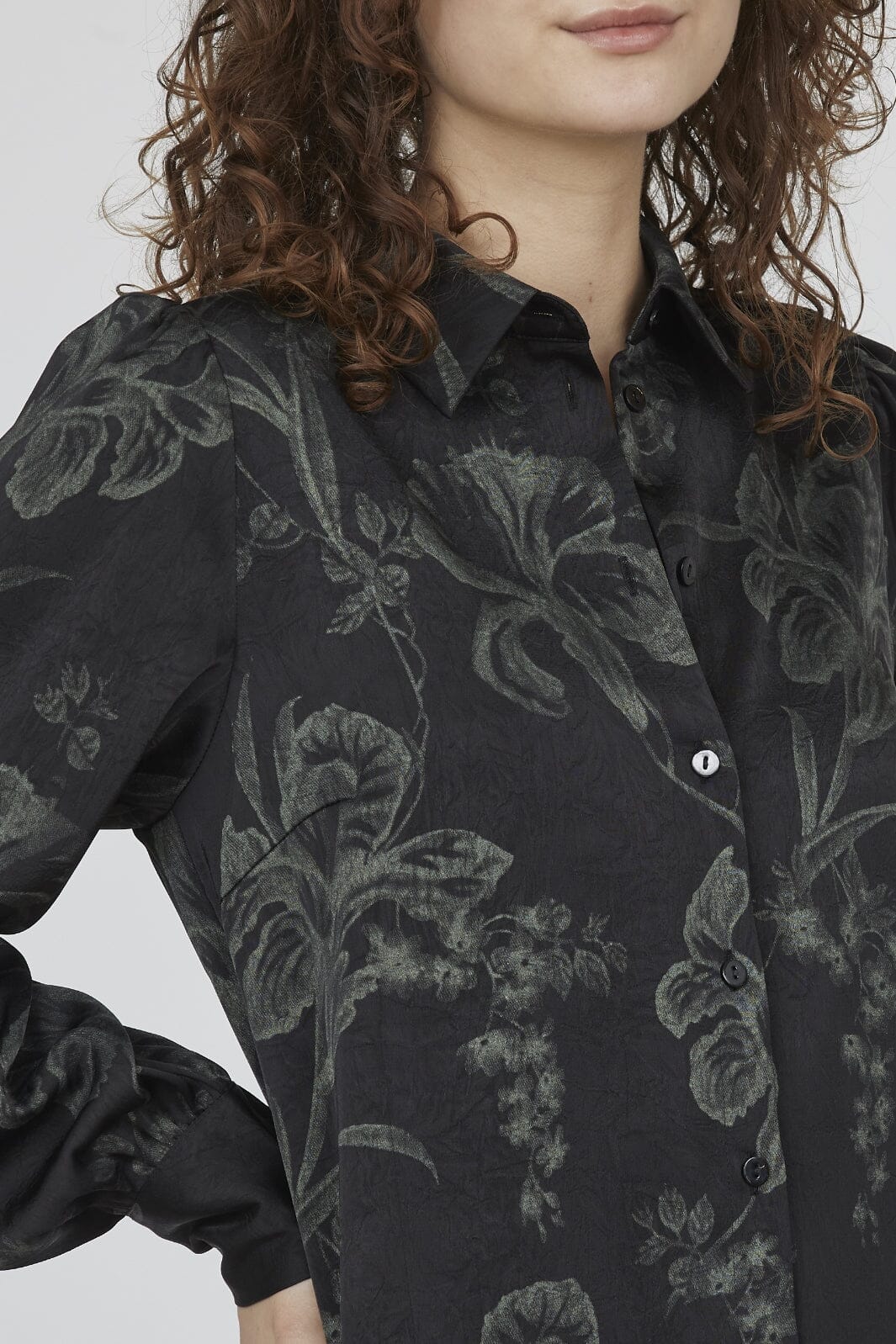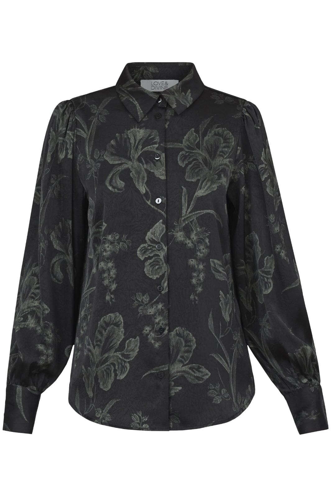Musta paita vihreillä kukilla Love & Divine -merkiltä. Paidassa on puffihihat ja klassinen kauluspaita, jossa on nappilukitus edessä.