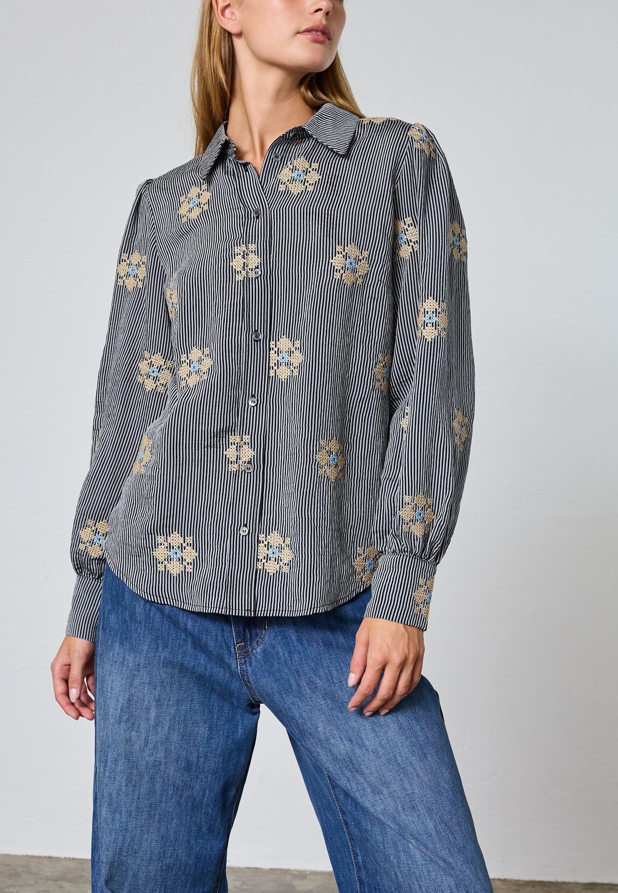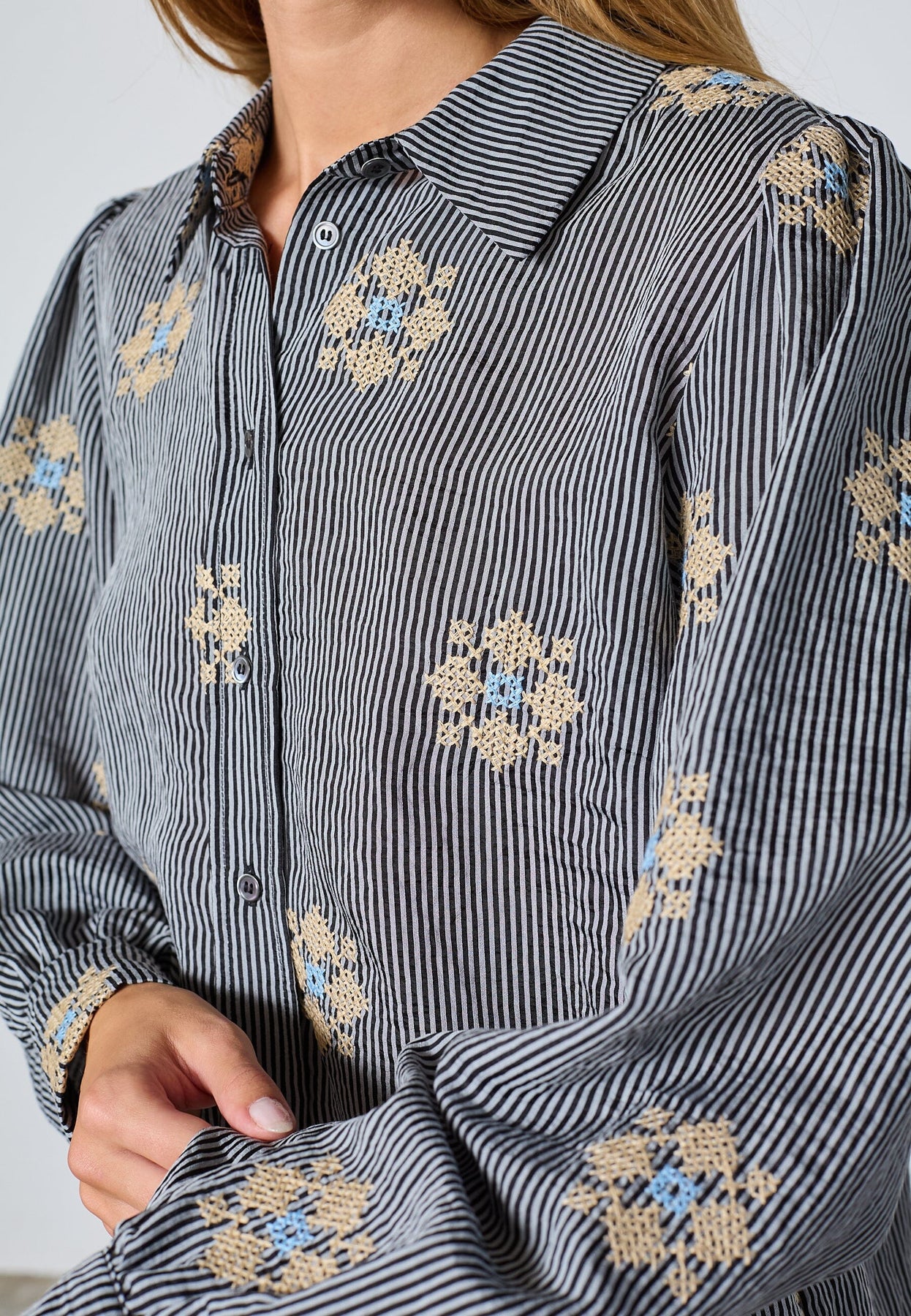 Raidallinen paita Love & Divinelta, mustavalkoisilla raidoilla. Paidassa on kirjailtuja kukkayksityiskohtia, jotka luovat kontrastin raidalliseen kuvioon.