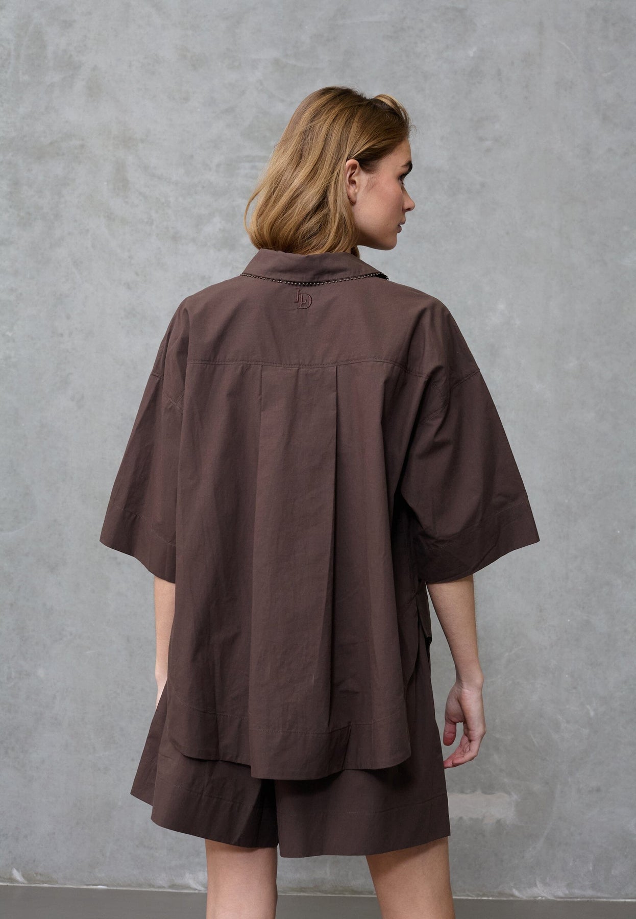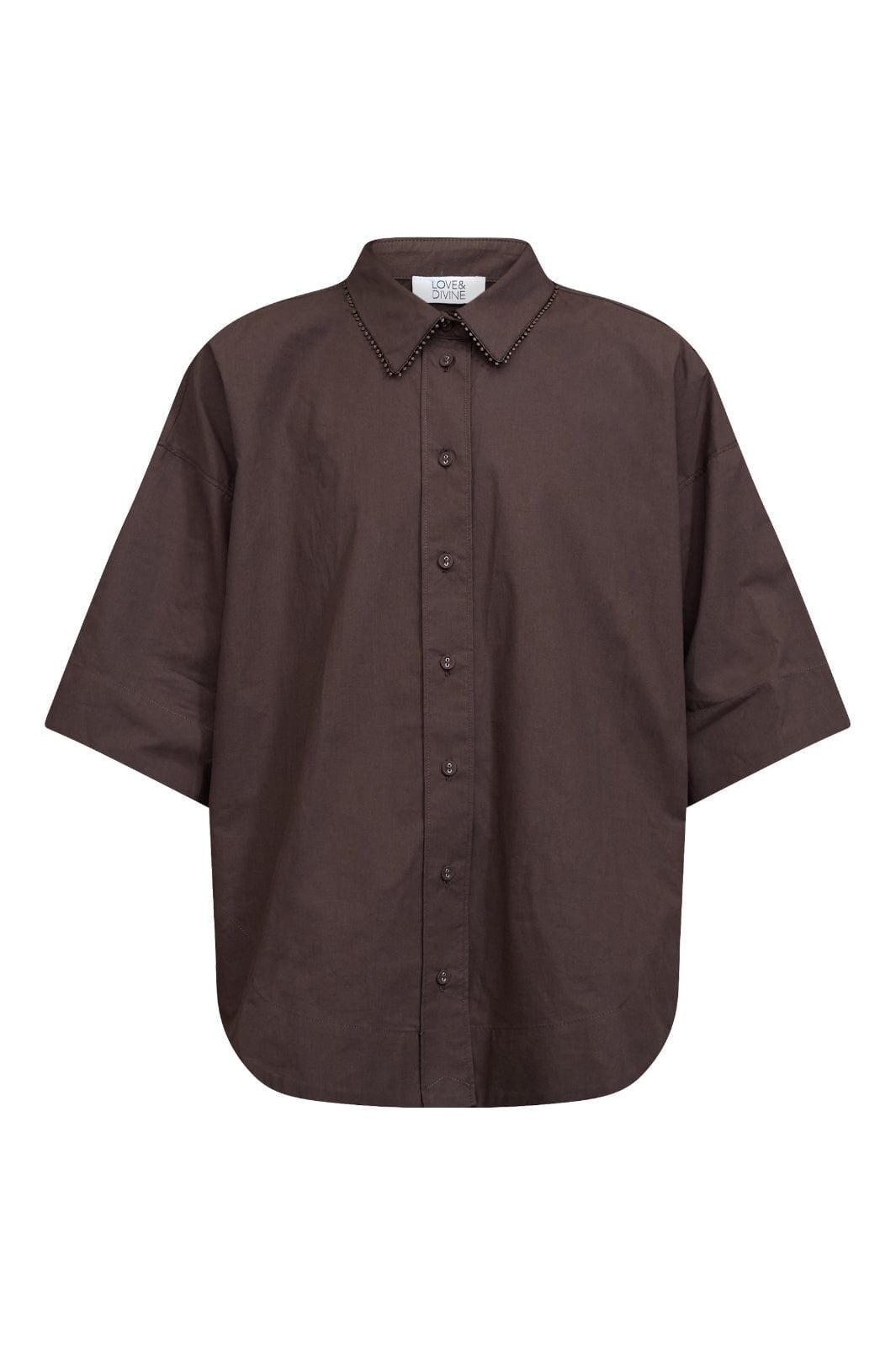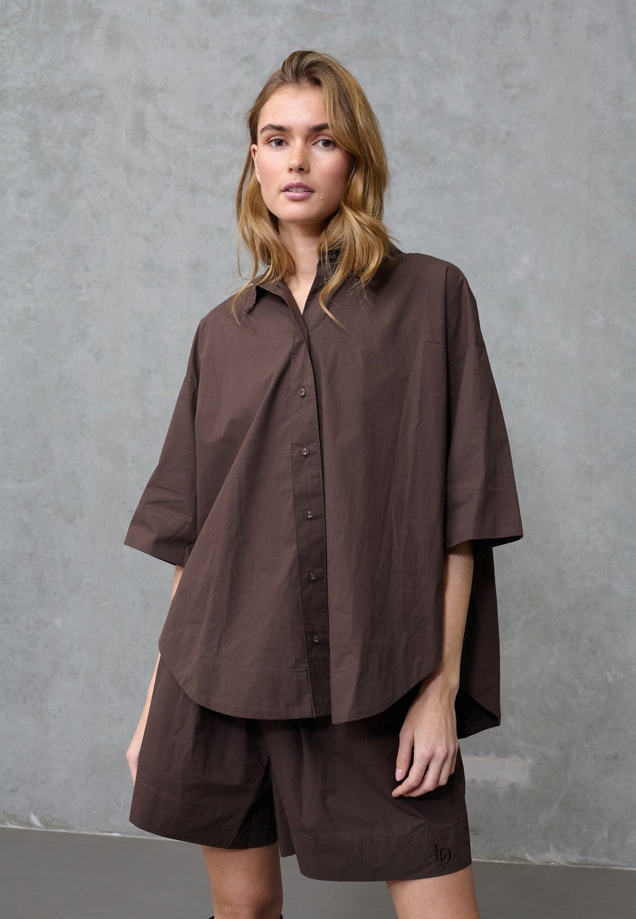 Ruskea paita Love & Divinelta, valmistettu 100 % puuvillasta. Paidassa on oversized-istuvuus, laatikkomainen siluetti ja pudotetut olkasaumat.
