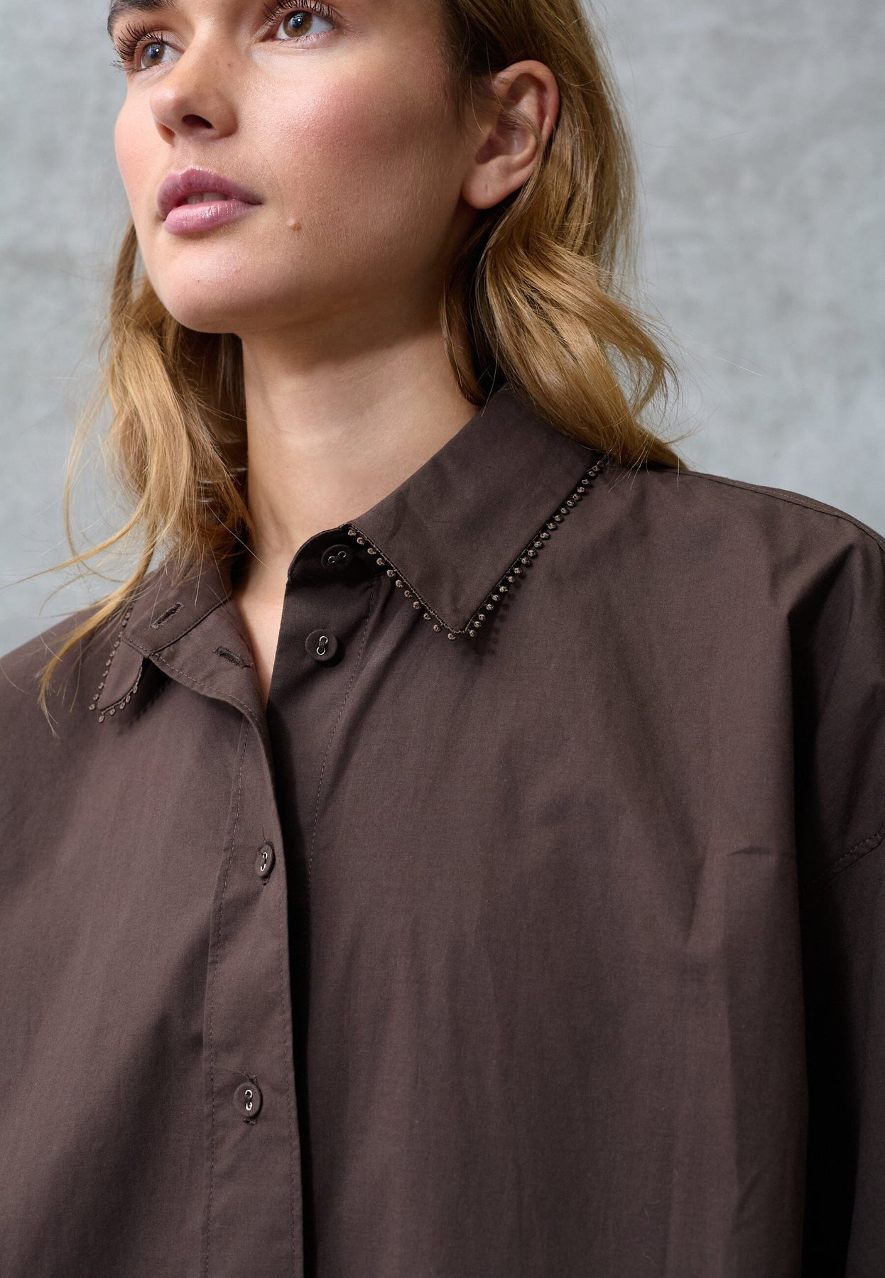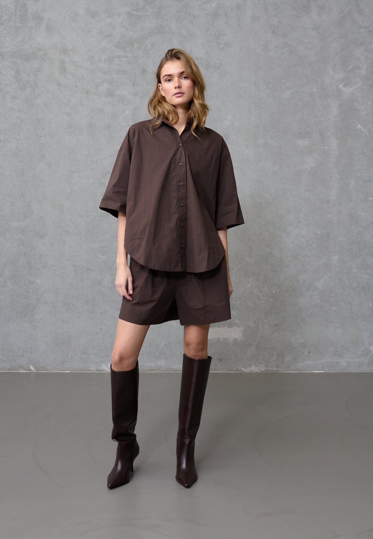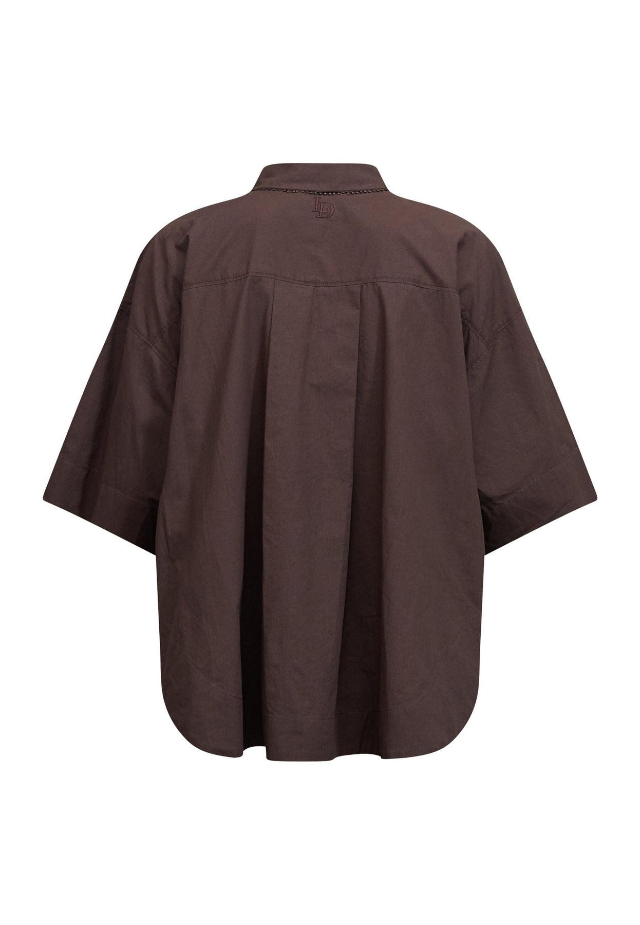 Ruskea paita Love & Divinelta, valmistettu 100 % puuvillasta. Paidassa on oversized-istuvuus, laatikkomainen siluetti ja pudotetut olkasaumat.