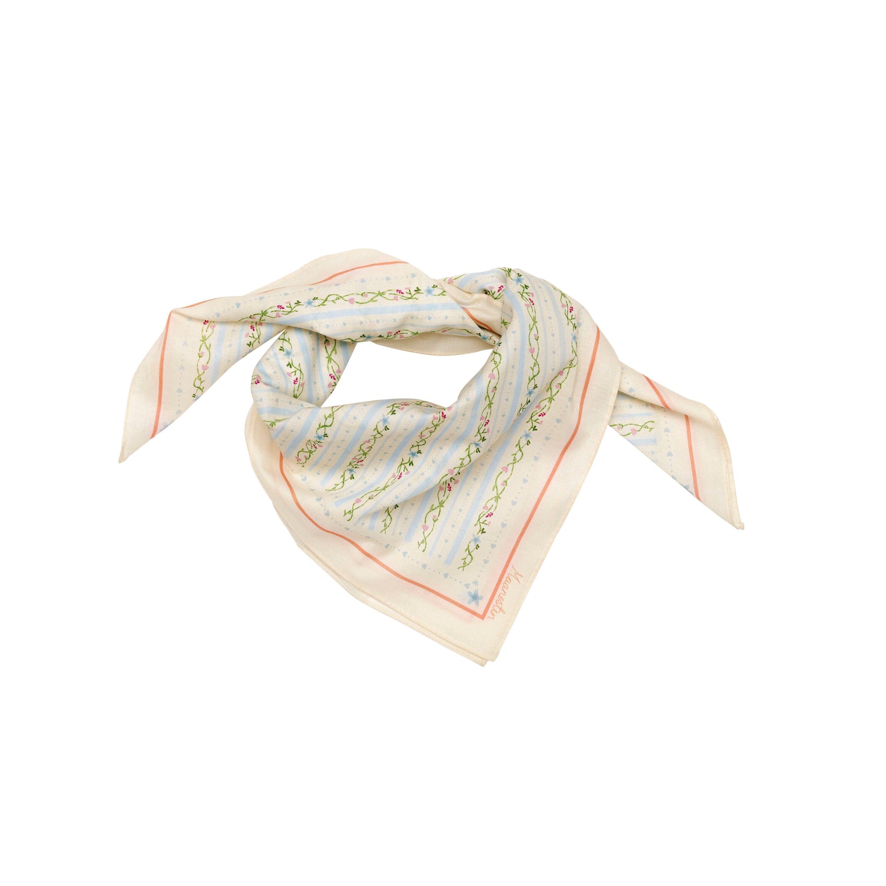 Huivi Maanestenilta, jossa on vaaleansiniset raidat ja kukkaprintti. Huivissa on kermanvärinen pohja, vaaleansiniset raidat ja kukkayksityiskohtia vihreän ja vaaleanpunaisen sävyissä.
