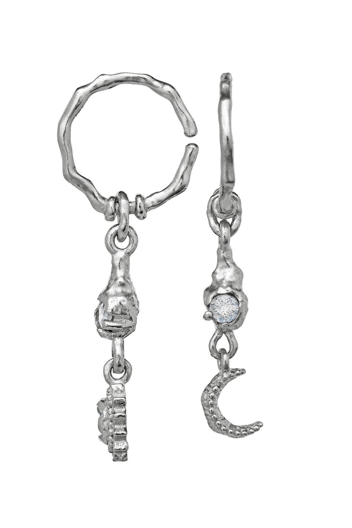 Hopeakorvakorut Maanestenilta epäsymmetrisillä aurinko- ja kuumotiiveilla. Ne on käsintehty kierrätetystä sterlinghopeasta, ja niiden pituus on 27,5 mm.