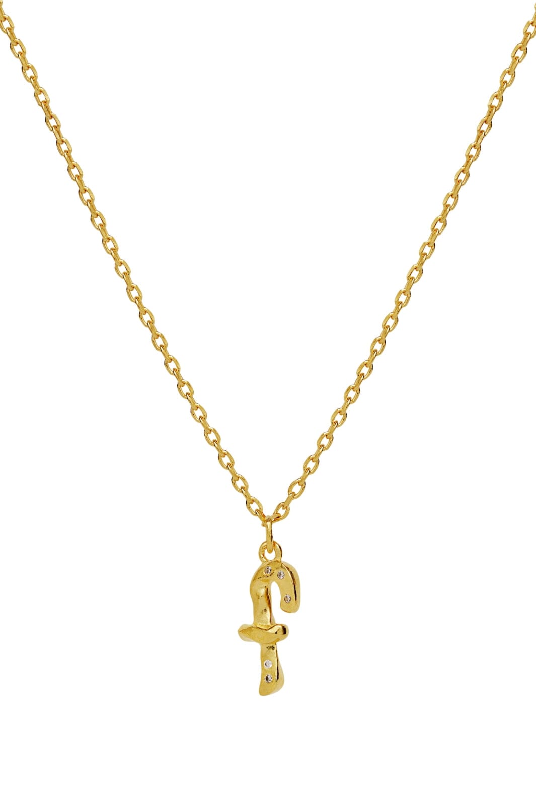 Kultapinnoitettu kaulakoru Maanestenilta, jossa on F-muotoinen riipus. Kaulakoru on valmistettu kierrätetystä sterlinghopeasta, jossa on 18 karaatin kultapinnoite. Ketjussa on lukko ja jatkoketju.