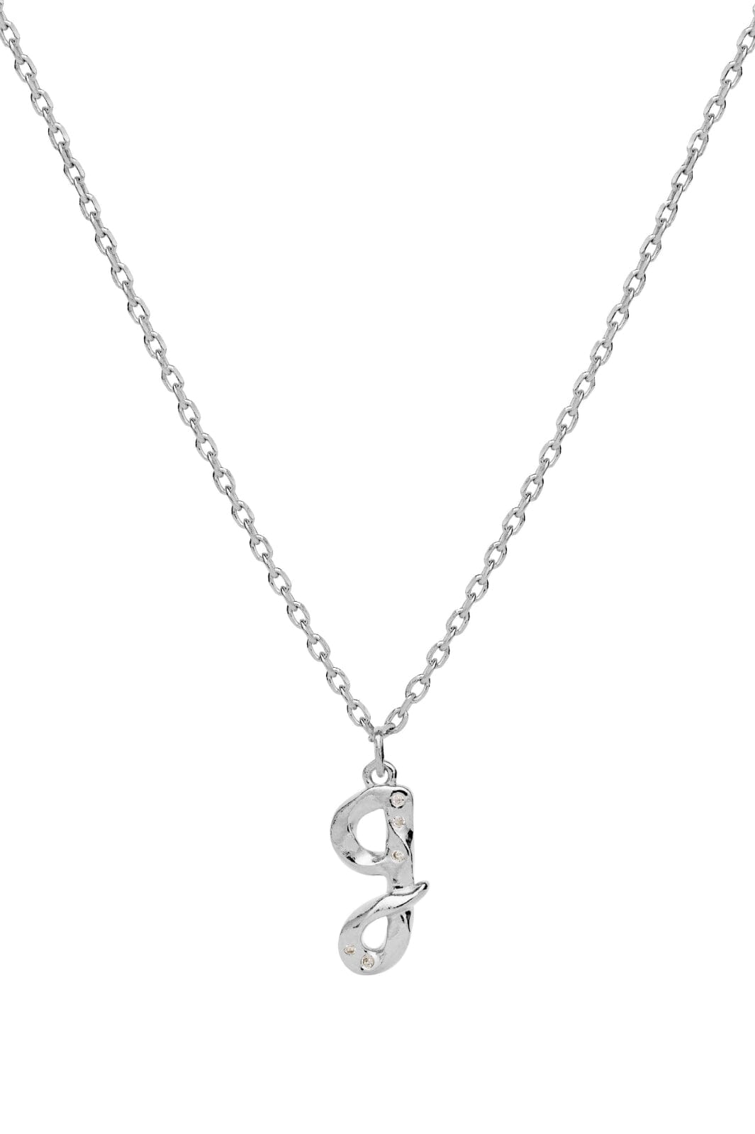 Hopeaketju Maanestenilta, jossa on G-kirjain riipuksena. Riipuksessa on pieniä kristalliyksityiskohtia, jotka kimaltelevat valossa, ja se on valmistettu tyylitellyssä muotoilussa.