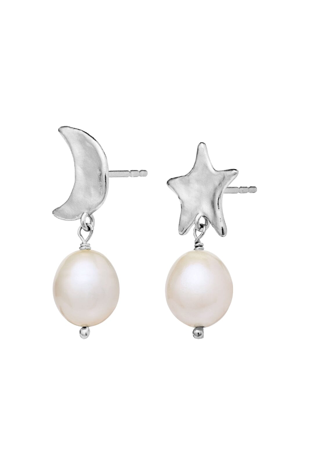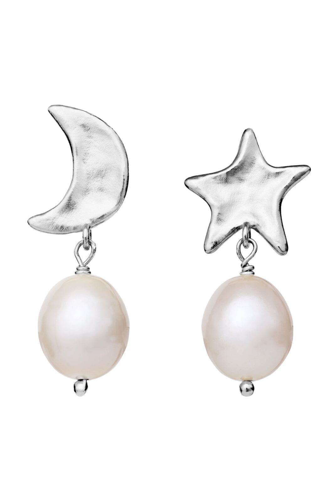 Hopeakorvakorut Maanestenilta, joissa on kuu- ja tähtimuotoiset riipukset. Epäsymmetrisissä korvakoruissa on valkoisia helmiä ja kiiltävä pinta kierrätetystä sterlinghopeasta.