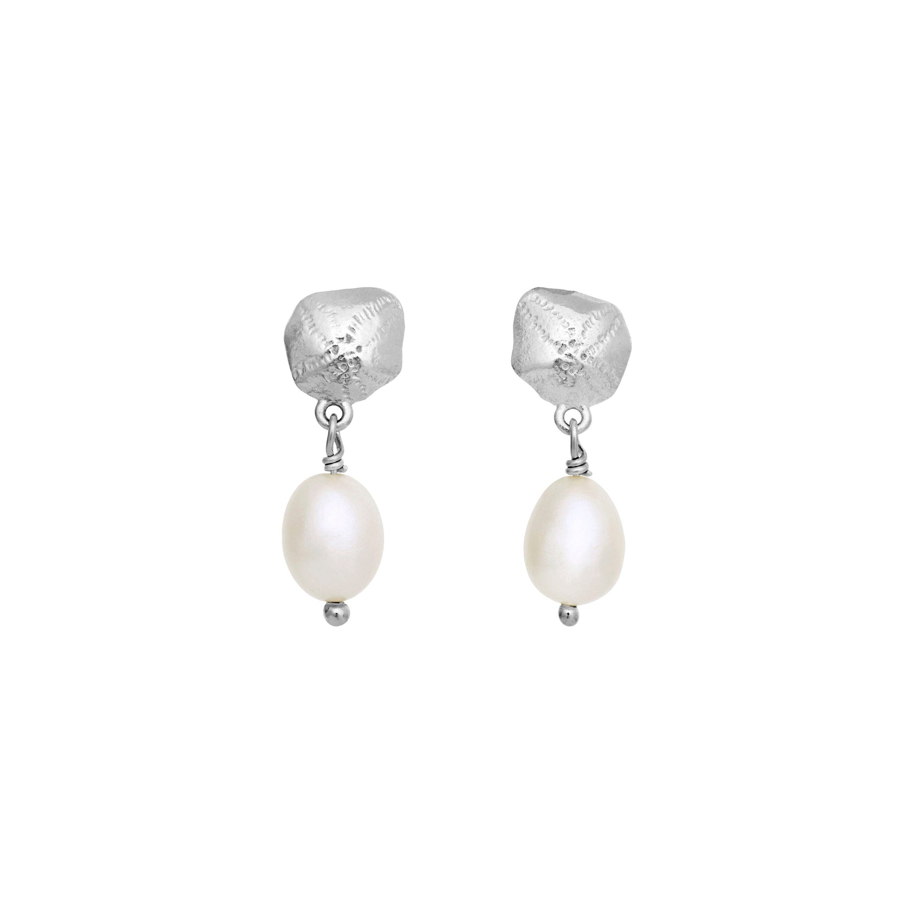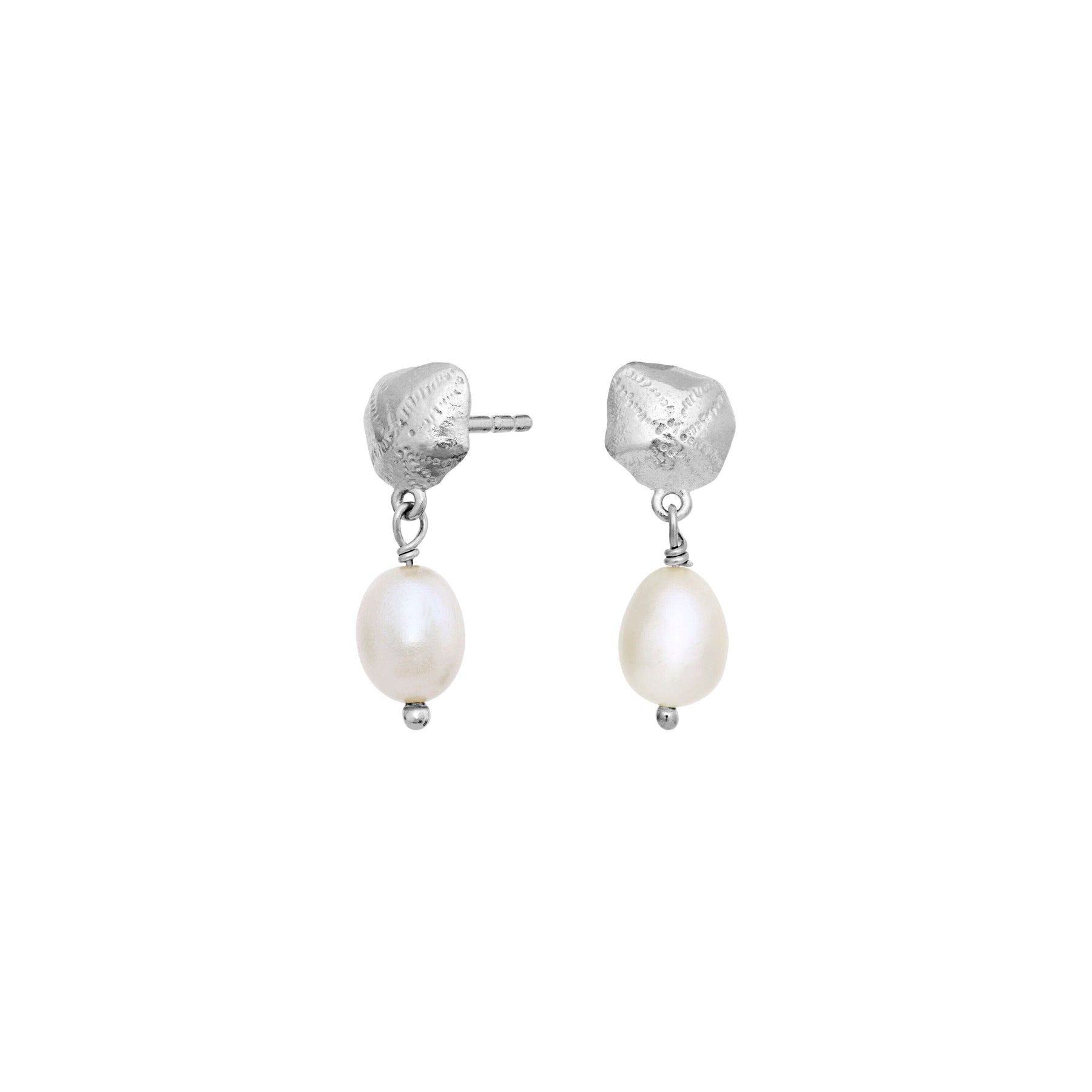 Maanesten-korvakorut, valmistettu kierrätetystä sterlinghopeasta. Muotoilussa on epäsäännöllinen metallirakenne ja pisaranmuotoinen helmi.