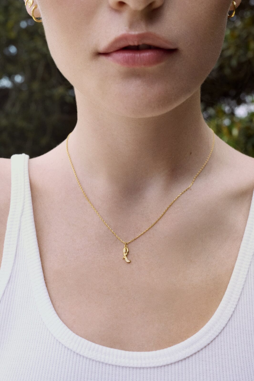 Kultaketju Maanestenilta L-muotoisella riipuksella. Ketju on valmistettu kierrätetystä sterlinghopeasta, jossa on 18 karaatin kultapinnoite, mikä antaa korulle lämpimän kultaisen värin.